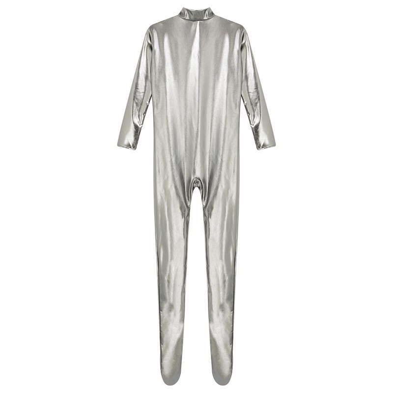 Designs with mock neck, long sleeve, full body coverage, metallic shiny surface, front zipper from neck to crotch, slim fitting.