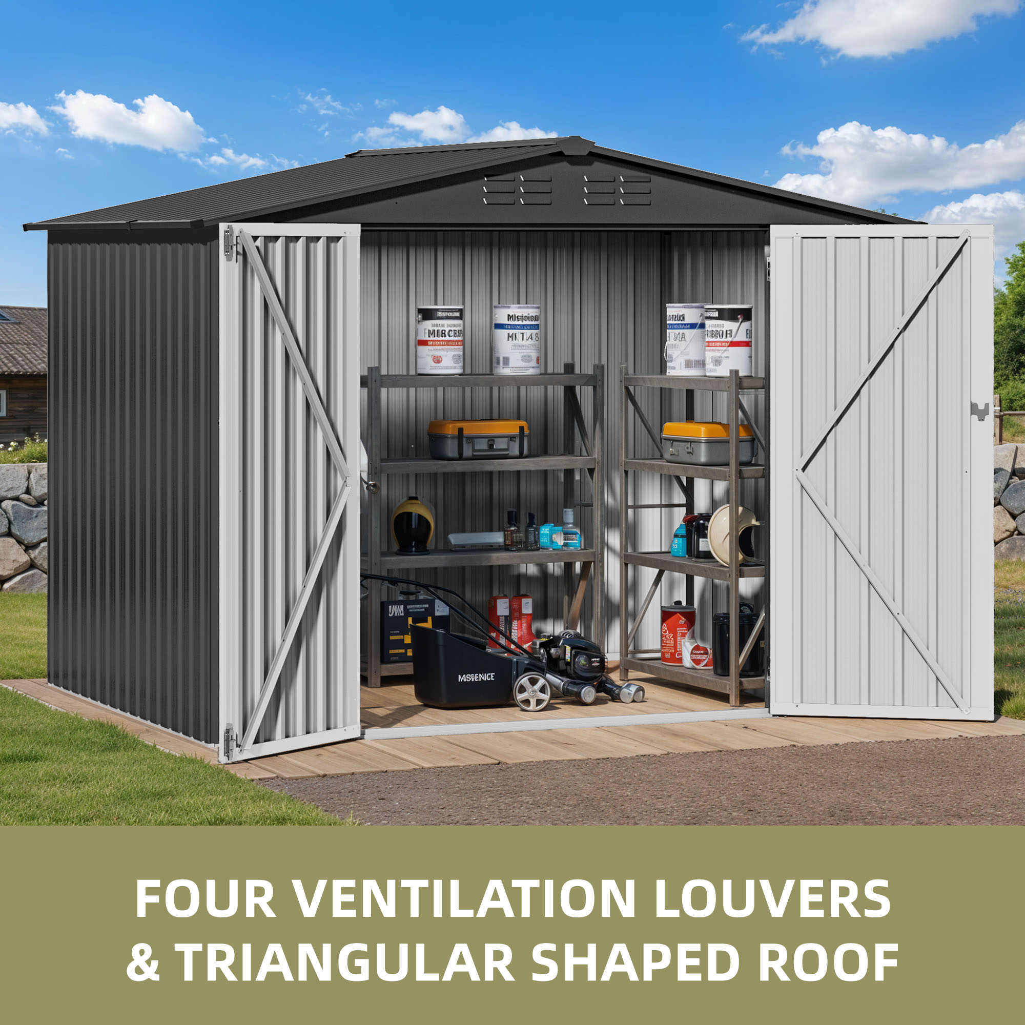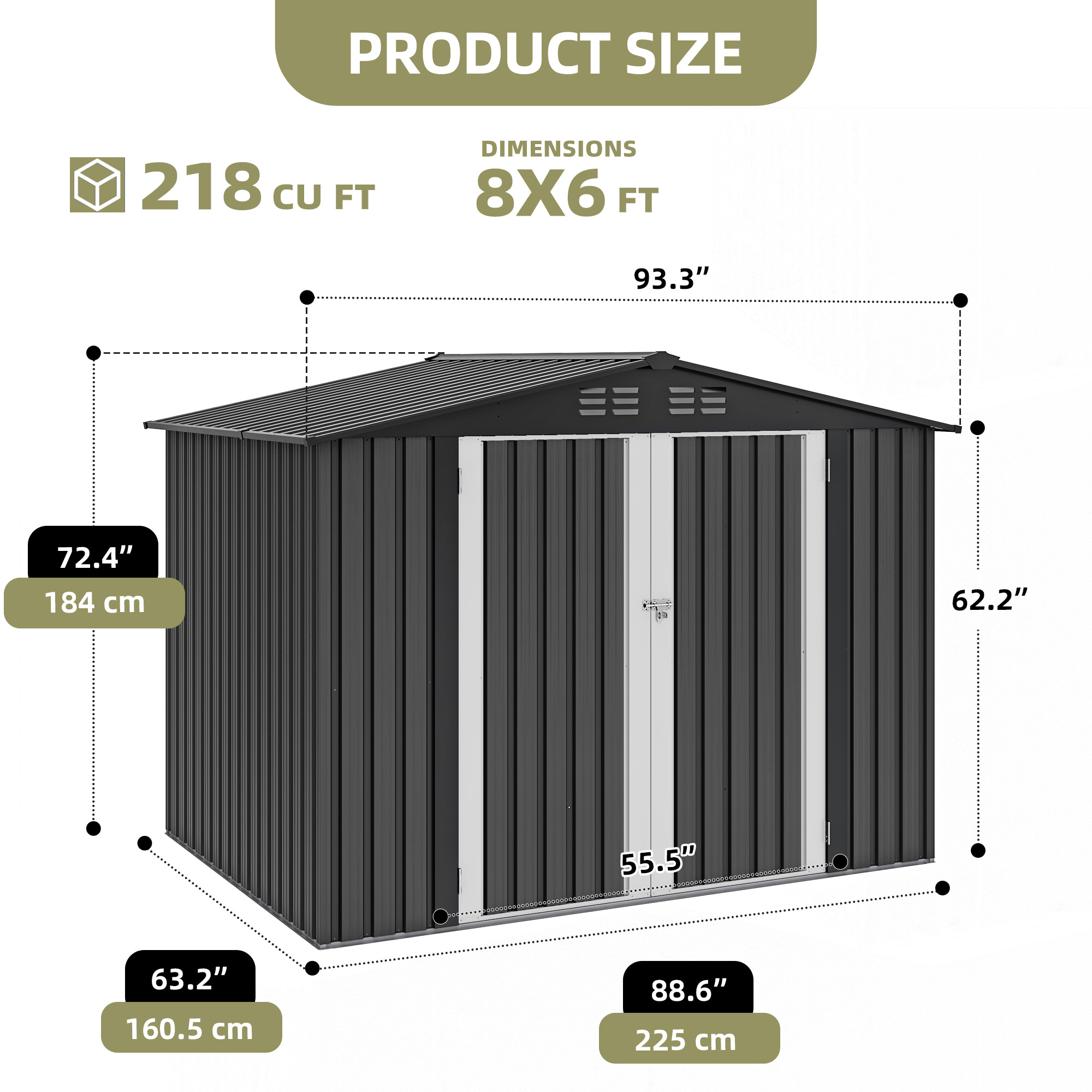 This large shed measures 93.3"L x 63.2''W x 72.4''H with a door size of 62.2''L x 55.5''W, providing ample space to store your outdoor equipment like tools, bikes, and lawn mowers. It's perfect for keeping your backyard or garden organized..