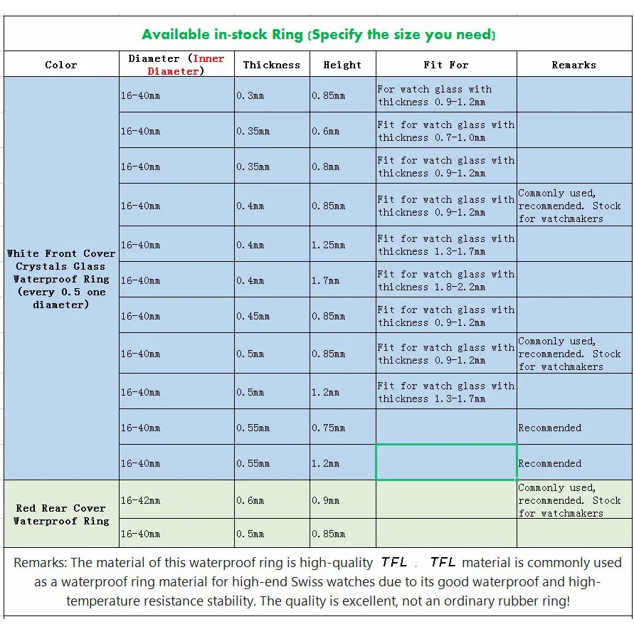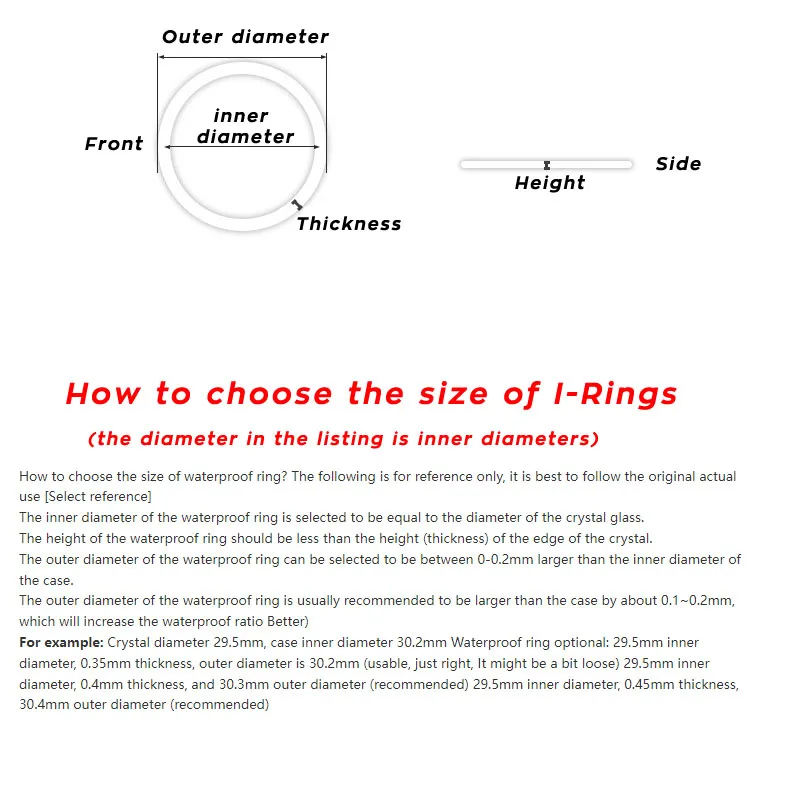 For example: Crystal diameter 29.5mm, case inner diameter 30.2mm Waterproof ring optional: 29.5mm inner diameter, 0.35mm thickness, outer diameter is 30.2mm (usable, just right, It might be a bit loose) 29.5mm inner diameter, 0.4mm thickness, and 30.3mm outer diameter (recommended) 29.5mm inner diameter, 0.45mm thickness, 30.4mm outer diameter (recommended)