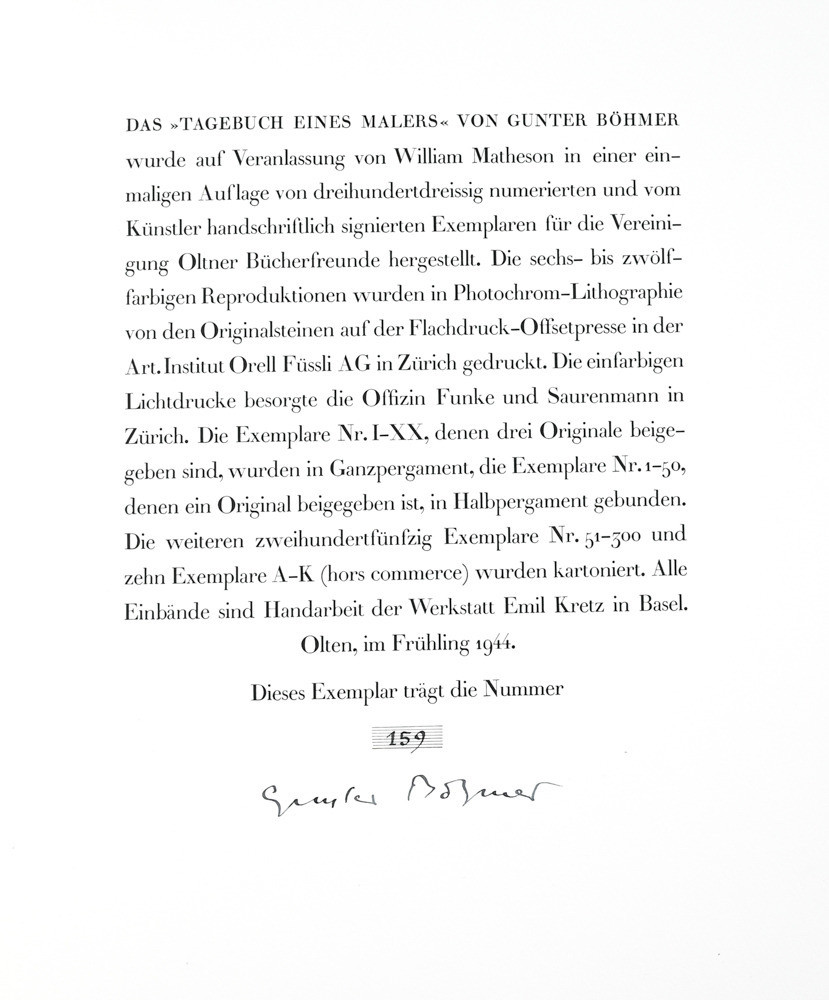 Böhmer, Gunter. Tagebuch eines Malers. Olten, Vereinigung Oltner Bücherfreunde, 1944. 35 x 25 cm. Mit 70 einfarbigen und 80 mehrfarbigen Zeichnungen auf Tafeln Original-Pappband im Schuber.