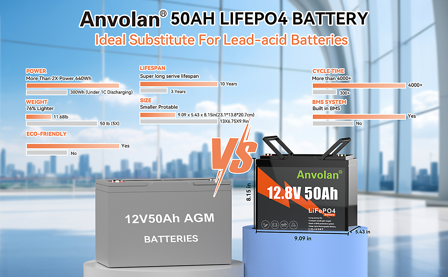 Leichtes Design: Anvolan 12V LiFePO4 Batterie bis zu 70% leichter als herkömmliche Blei-Säure-Batterien, so dass es einfach zu transportieren und zu installieren ist.