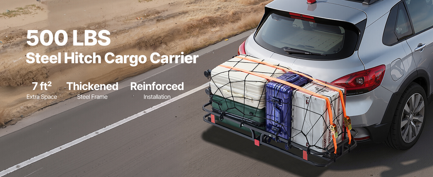 Our hitch cargo carrier offers extra-large storage without taking up space in your car and can hold up to 500lbs. Made of heavy-duty steel, the hitch stabilizer enhances stability, avoiding jiggle or deformation while driving, so you can transport your items with confidence.