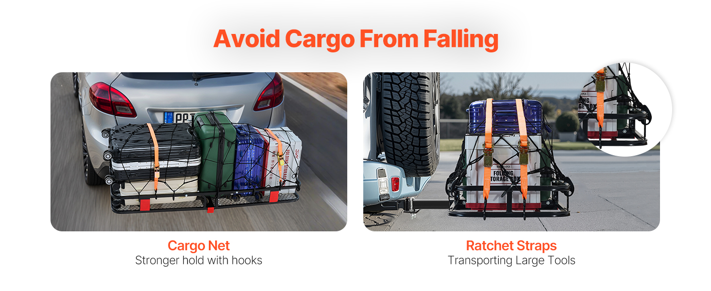 Double Fall-Proof: Our hitch cargo carrier is equipped with cargo net with hooks and ratchet straps. Your items are firmly fixed on the luggage frame. It is not easy to shake and fall when driving on bumpy road. It is more stable and ensures secure transportation.