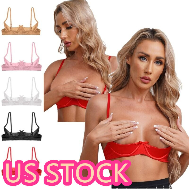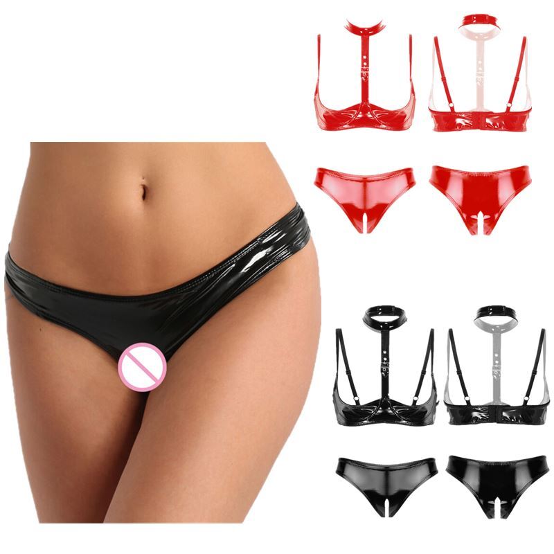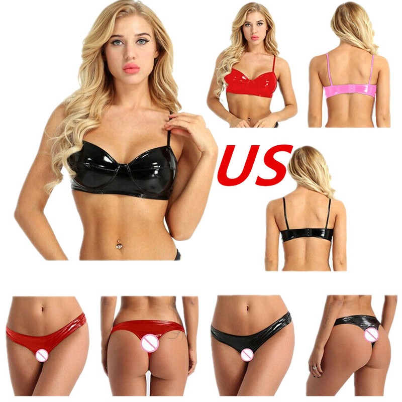 Womens Wet Look Patent Leather Open Cup Bra Tops O Ring Lingerie Underwear.