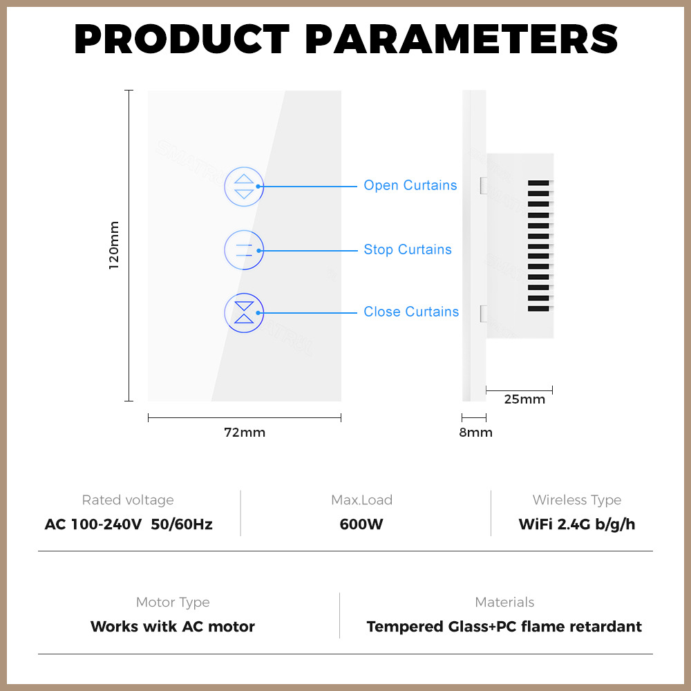 1. Smart WiFi touch window roller shutter switch, Wifi Bluetooth dual mode, connect to the network faster, connect to the network speed is 3 times faster than WiFi single mode, WIFI Bluetooth dual mode is more stable and faster.