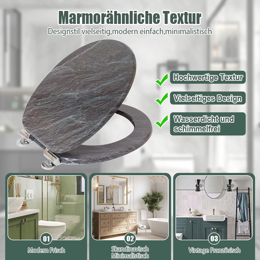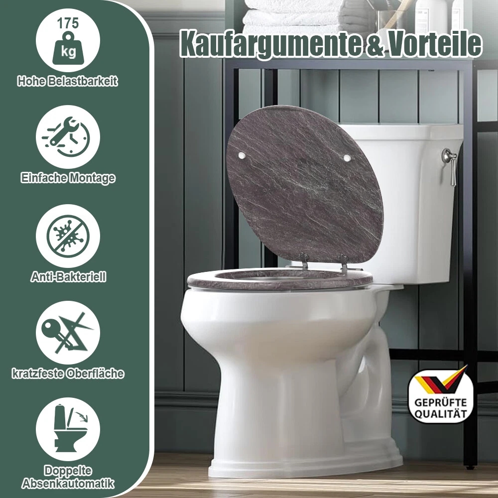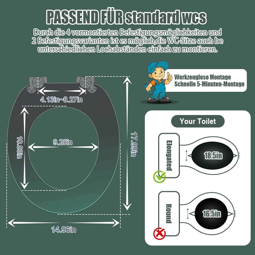EINFACHE REINIGUNG: Für Ihren Komfort konzipiert, verfügt dieser Toilettensitz über Scharniere, die es ermöglichen, den Sitz leicht für eine gründlichere Reinigung zu entfernen; verwenden Sie dabei milde Reinigungsmittel, um die Oberfläche zu schonen. Künstlerisches Muster: Sorgfältig bemalt oder mit künstlerischen Mustern bedruckt, sei es ein abstrakter Farbkontrast oder eine lebendige figurative Szene, wird er zu einer einzigartigen Gestaltung im Badezimmer, wie ein kleines Kunstwerk, das die Persönlichkeit und den künstlerischen Geschmack des Nutzers zeigt und einen Farbtupfer in das ansonsten eher schlichte Badezimmer bringt. FÜR DEN TÄGLICHEN GEBRAUCH GEBAUT: Dieser geformte MDF-Toilettensitz, mit einer maximalen Belastbarkeit von 190 kg, ist so konzipiert, dass er jahrelang intensiver Nutzung standhält, ohne zu reißen, sich zu verformen, abzublättern oder zu verfärben, selbst in stark frequentierten Haushalten. Kompatibilität: Sie können sich darauf verlassen, dass dieser Toilettensitz für die meisten Toiletten geeignet ist, mit den Maßen 16,93'' x 14,57''. PVC-Folie: 4 Seiten