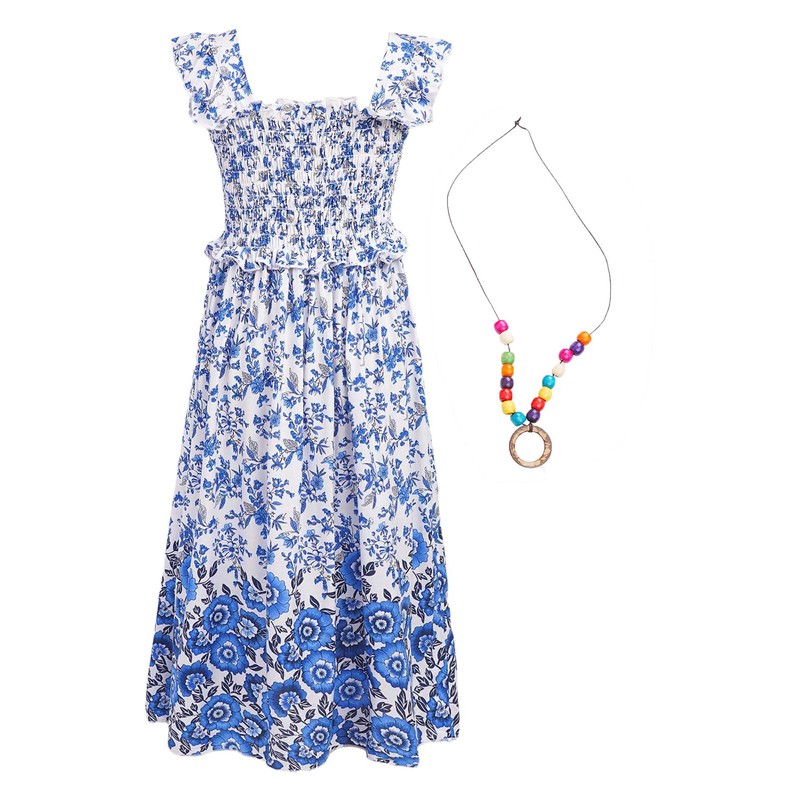 Floral prints, ruffled details and smocked bodice add an adorable element. Come with a necklace.