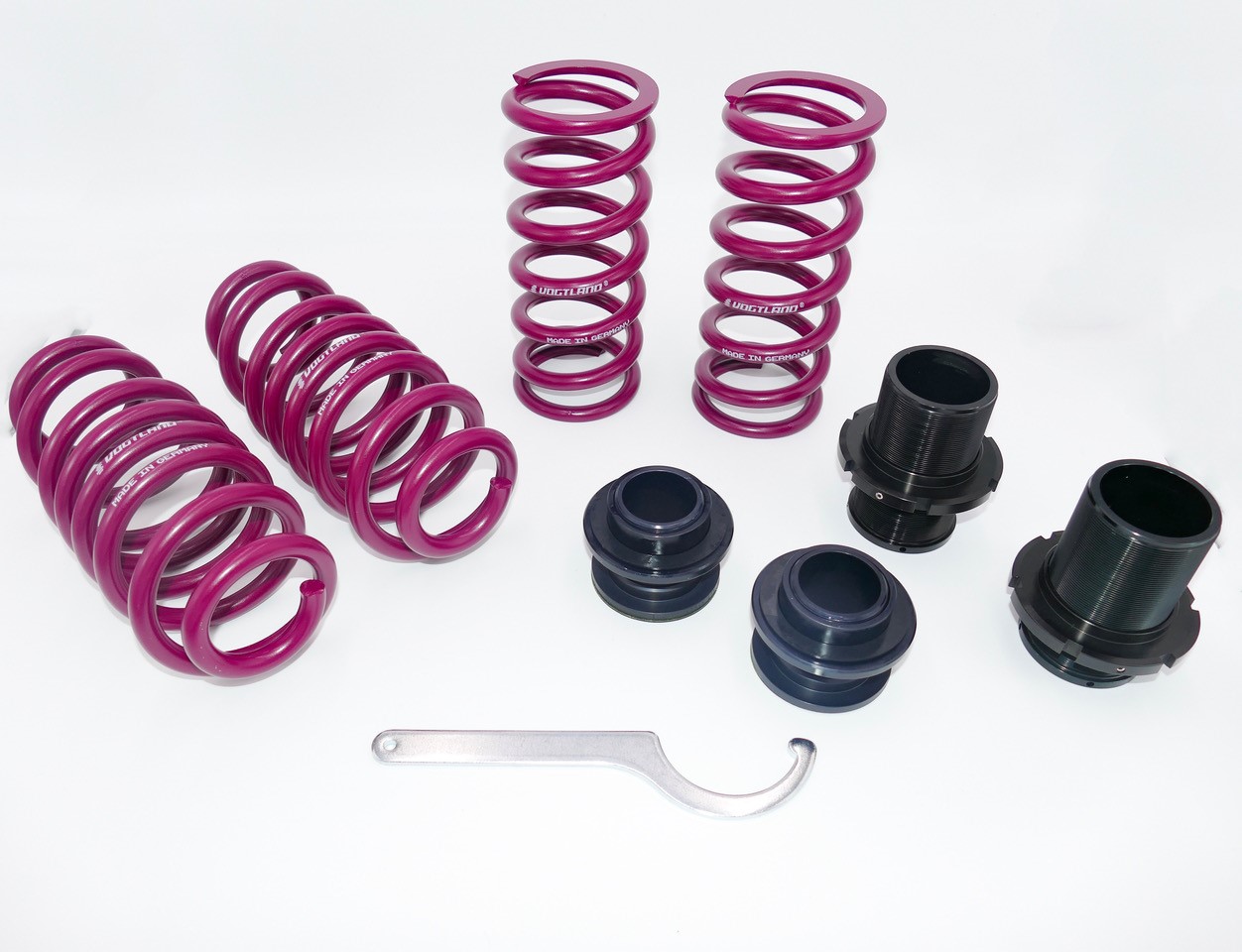 Der Vogtland höhenverstellbare Federsatz wird zur Tieferlegung des Fahrzeugs in Kombination mit den serienmäßigen Dämpfern verwendet. Im Gegensatz zu herkömmlichen Federsätzen ist eine individuelle Höhenanpassung innerhalb des geprüften Einstellbereichs möglich.