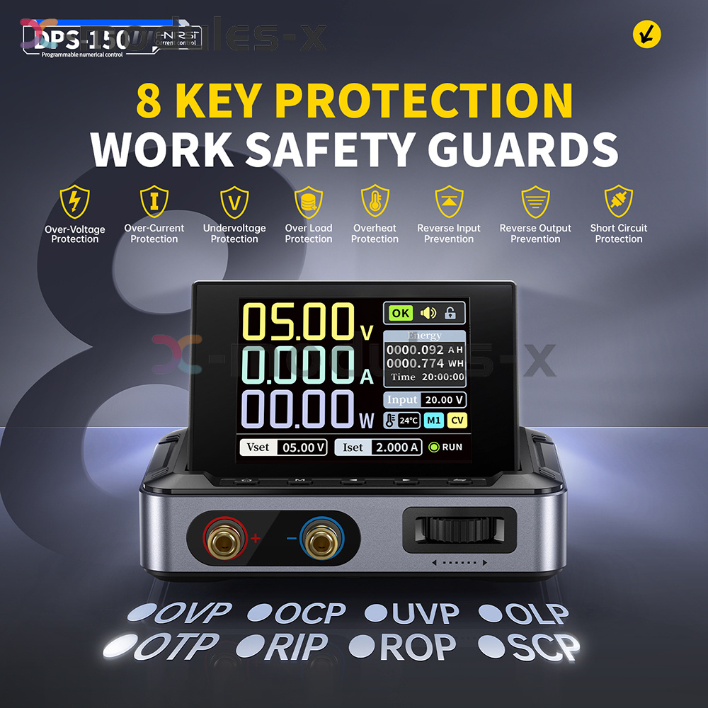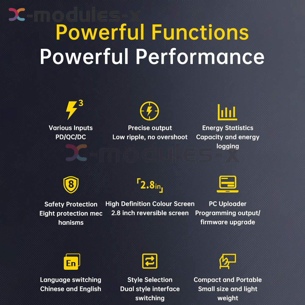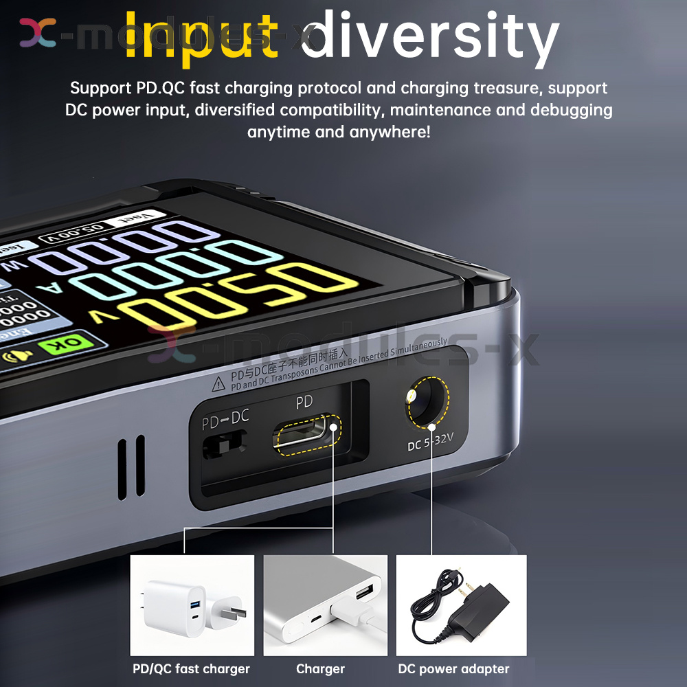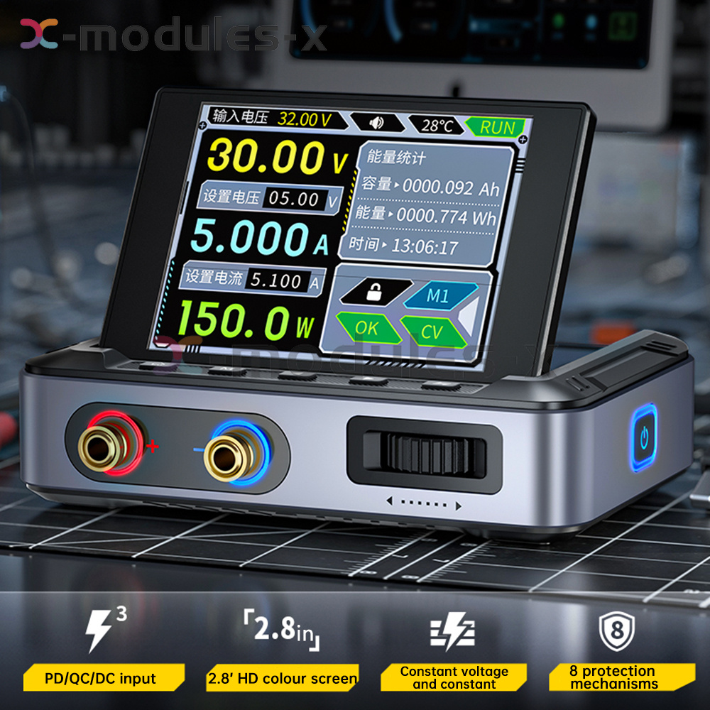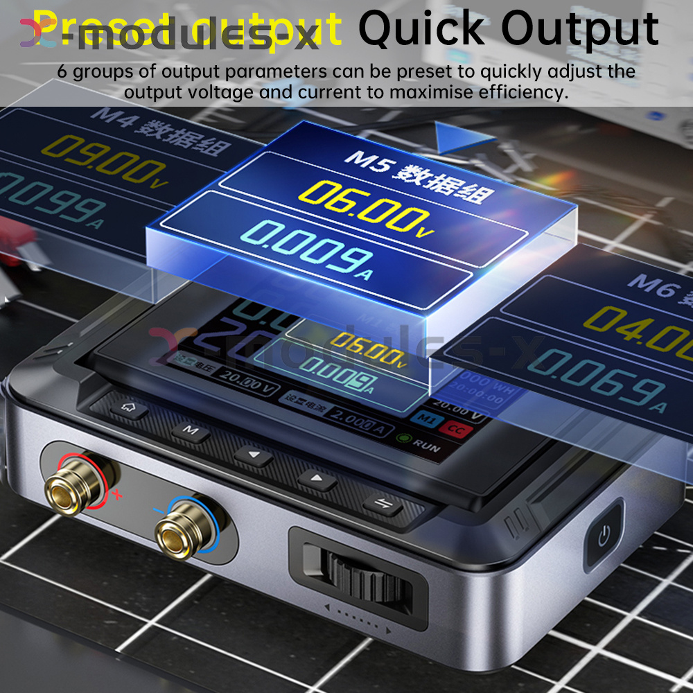 Features: 1. High-precision measurement and setting: Voltage and current accuracy ≤ 0.1%, resolution up to 10mV/1mA, ensuring precise control. 2. High-efficiency output: full-load efficiency of 96.30%, load adjustment rate of only 0.49%, to provide stable and reliable power output. 3. Wide-range input and output: support DC5.0V~32V input, 0~30V/0~5A output, covering a variety of application scenarios. 4. Multiple protection mechanisms: over-voltage, over-current, under-voltage, over-power and other eight protection, safer and more reliable use. 5. Intelligent fast charging protocol: support PD and QC fast charging protocol, suitable for charging treasure and other devices, improve charging speed.