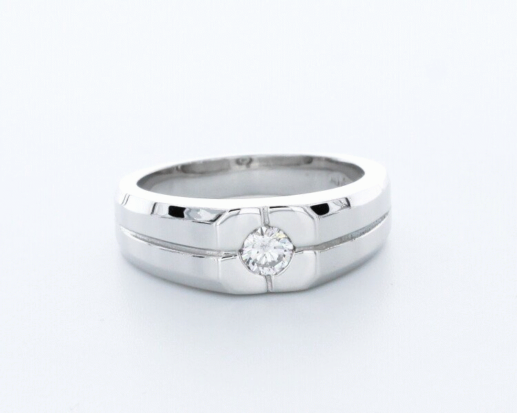 A strikingly sophisticated 14k white gold classic single stone right hand men's ring with a 0.31 carat round brilliant cut diamond certified by AGI Gemological Laboratories as a Natural Earth Mined Diamond with D color, VS2 clarity enhanced, and with Ideal cut and proportions. To emphasize the true brilliance of the stone on this costume piece our jewelry designer used bezel setting. The certificate report accompanied with this piece states the characteristics of the diamond and with estimate appraised value of $2,615.