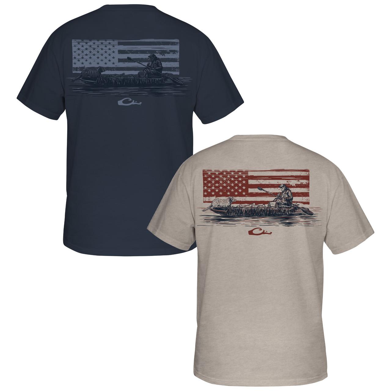 The Drake Waterfowl Graphic Tee is constructed with a 60% cotton and 40% polyester blend which supplies softness and comfort. The Drake Waterfowl Graphic Tee has a Drake logo on the front pocket and depicts a Pontoon overlay over an American Flag from our Americana Drake Series of graphic tees.