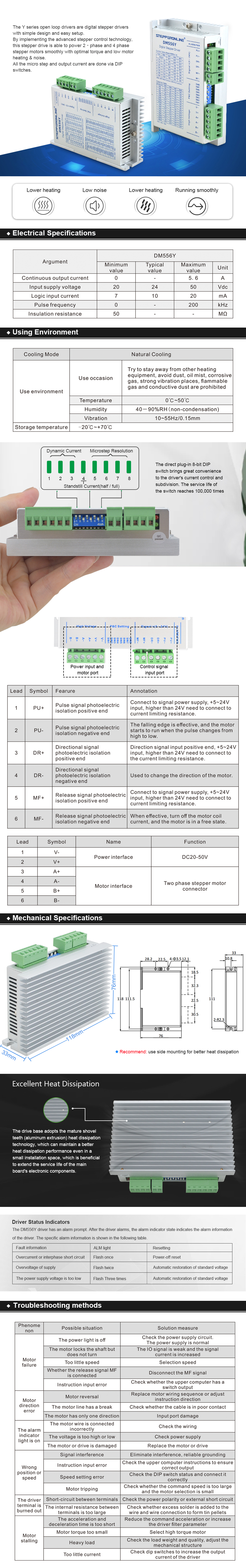 Dieser digitale Schrittmotortreiber der Y-Serie 1,7–5,6 A DC20 V–50 V für Nema 23, 24, 34 Schrittmotoren wird hauptsächlich in medizinischen Geräten, Abgabemaschinen, Graviermaschinen, Lasergeräten, Etikettiermaschinen, elektronischen Geräten, Werbegeräten und anderen Automatisierungsgeräten verwendet. Er ist besonders effektiv in Anwendungen, bei denen Benutzer geringe Wärmeentwicklung, geringe Geräuschentwicklung, geringe Vibration, hohe Stabilität und hohe Präzision erwarten.