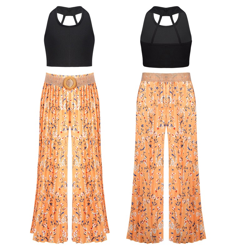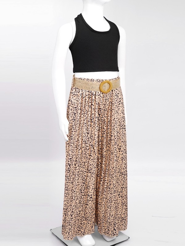 Girl’s 3-piece cute outfits include sleeveless cutout back ribbed crop top, pleated wide leg pants and belt.