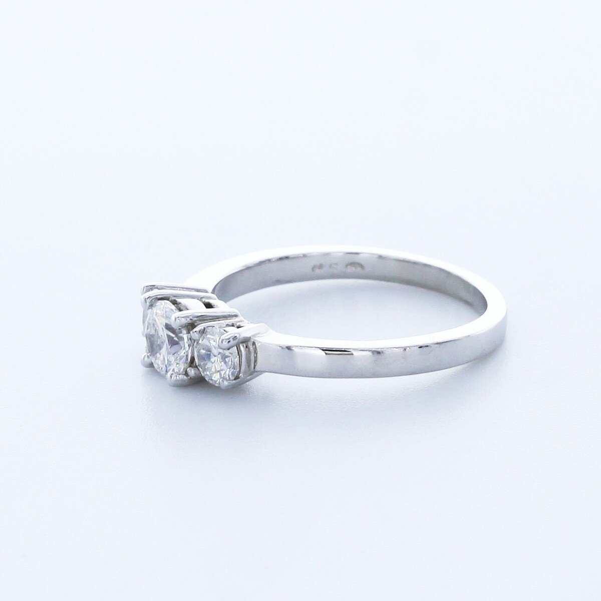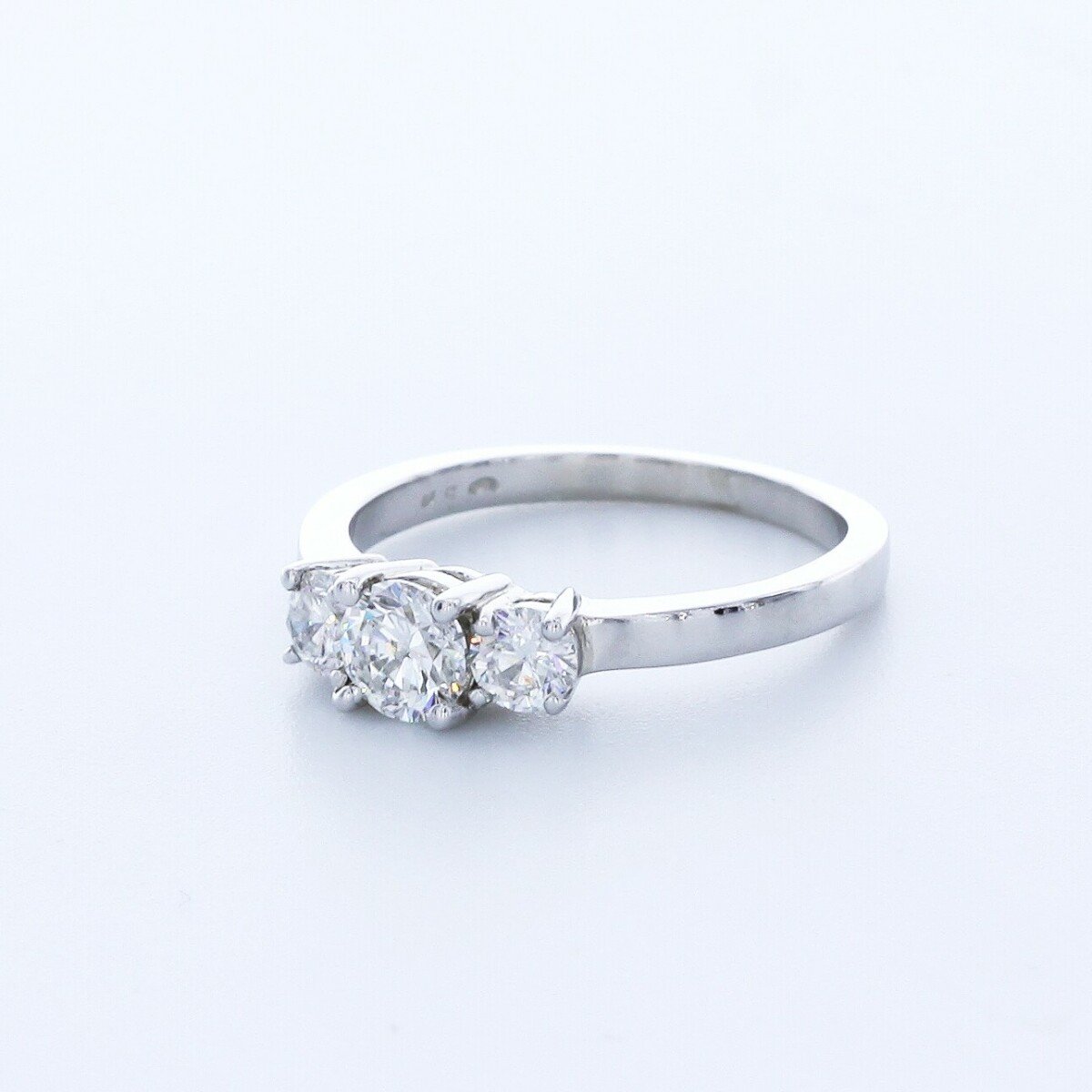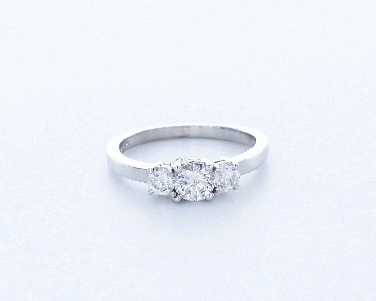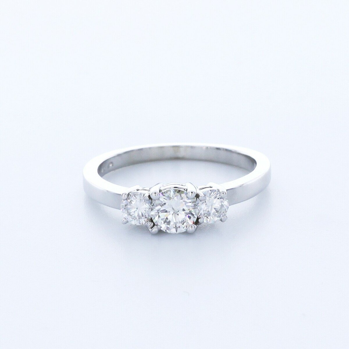 Delicate in design, this 1.46 carat total 18k white gold classic basket three stone anniversary ring. The center round brilliant cut diamond weight 0.75 carat certified by AGI Gemological Laboratories as a Natural Earth Mined Diamond with G color, SI1 clarity enhanced, and with Ideal cut and proportions. To accentuate the glow of the stone on this costume piece our jewelry designer used 4-prong setting for the main stone and 4-prong setting for the accent stones. This item will come with a 3rd party certificate and an estimate appraisal value of $4,352.
