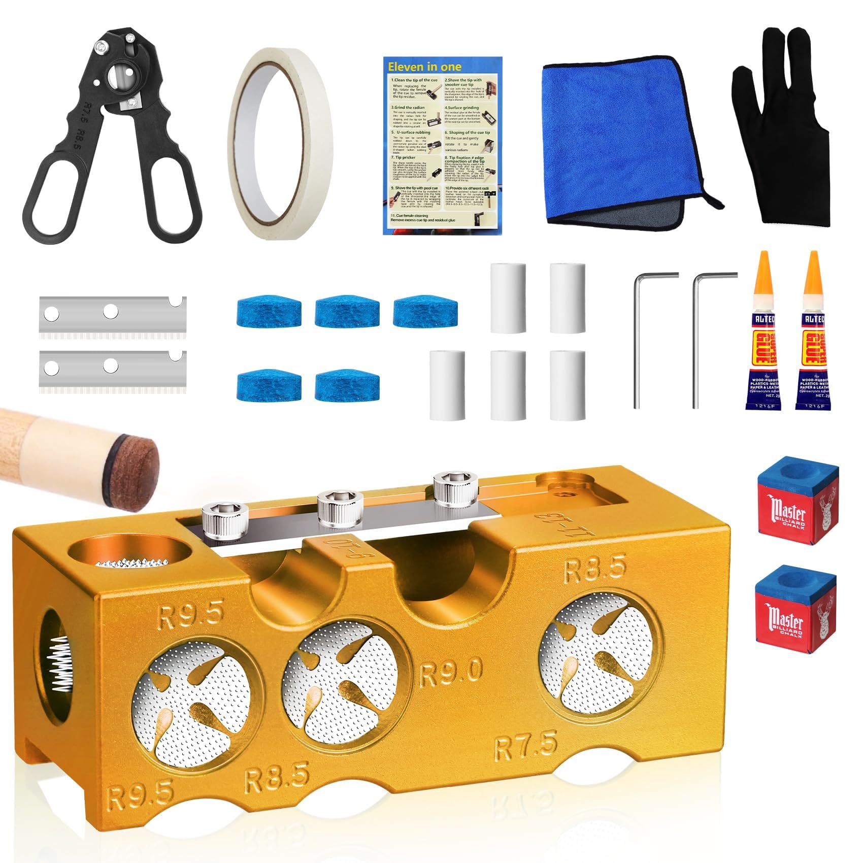 11-in-1 Aluminum Alloy Pool Cue Tip Shaper, Pool cue tips replacement kit,