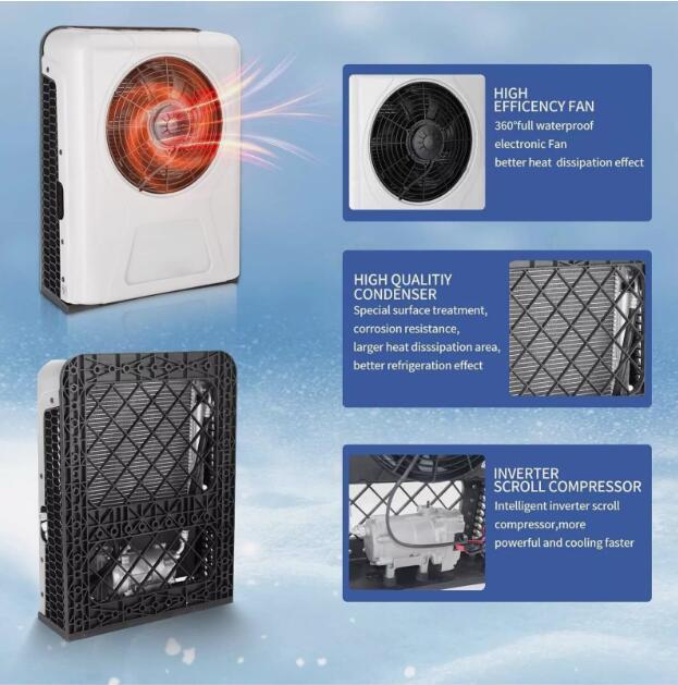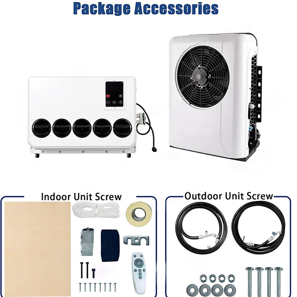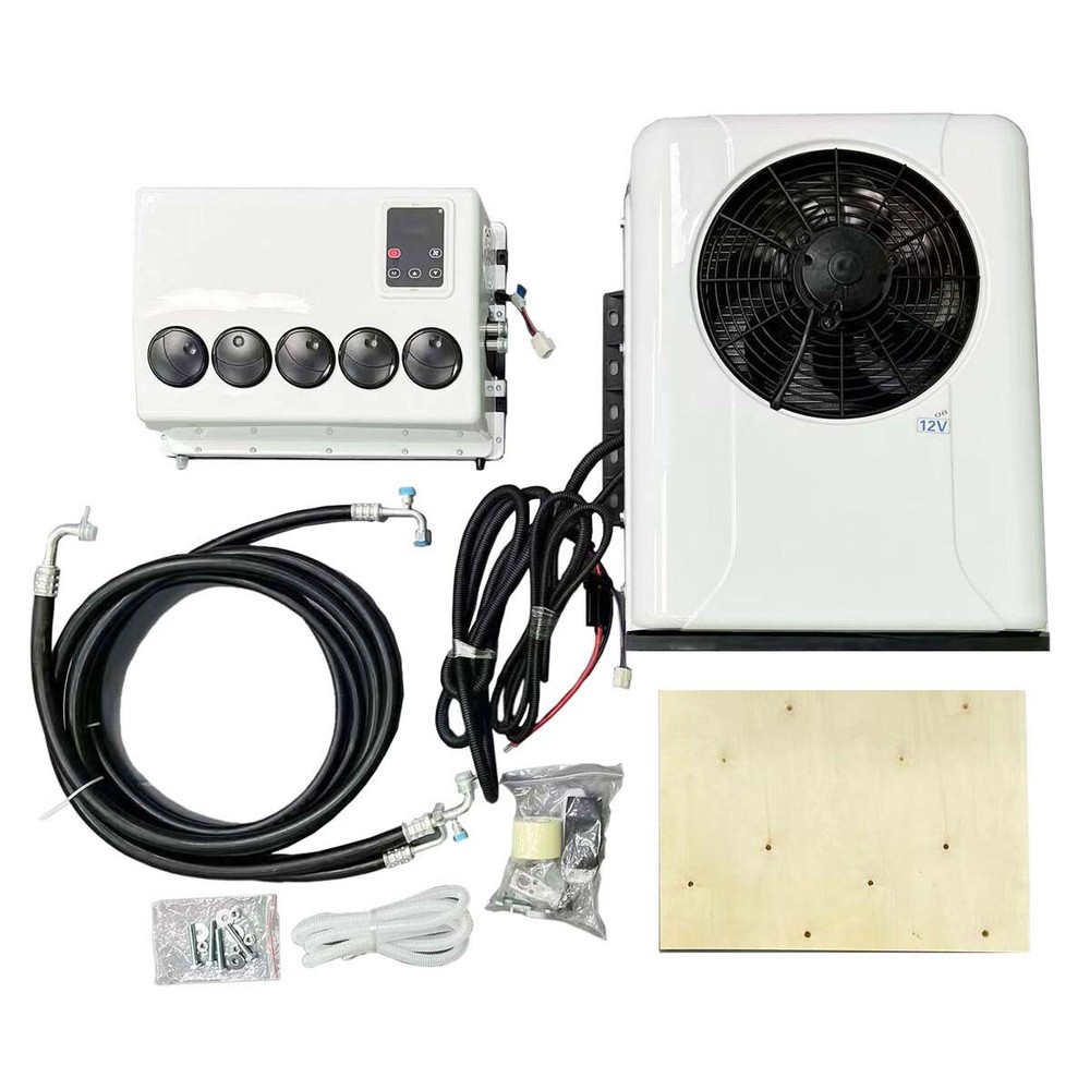 Item specification Current (A):60A-80A Rated power:960W Cooling capacity:1000W-3000W Refrigerant:R134A 600g (Not include in the package) Oil:90ml-120ml POE68 Circulating air volume: 600m³/H Range of Speed:1000-3000 Outdoor unit size:66*55*20 (cm) Indoor unit size:46*32*16 (cm) It is powered by the battery of the Truck car. WHAT IS PARKING AIR CONDITIONER ? The parking air conditioner is a kind of in-car air conditioner. It refers to the equipment that uses the on-board battery DC power supply (12V) to make the air conditioner run continuously when parking and waiting and resting, and to adjust and control the temperature, humidity, flow rate and other parameters of the ambient air in the car, so as to fully meet the comfort cooling needs of the truck driver. Normally drivers leaving the engine running for hours to use the air conditioner during parking or rest time at night, it is bad for the environment and tons of fuel wasted, it also wears down the engine faster. Parking air conditioner works with truck battery power without engine on which can save energy and fuel and at same time provide safe and comfortable environment for driver. Fuel,Energy And Money Saving. Digital frequency conversion control, more efficient and more energy saving. Use energy saving mode when you sleep at night, it can run continuously 6 to 8 hours. Use super mode in hottest hours, cooling rapidly and stronger air supply. WIDE RANGE OF USE: T hese DC 12V products are now widely used in the ventilation and air conditioning systems for the cabs in trucks, tractors and construction machinery. The DC Air Conditioner Kit is very easily connects to challenge confined space and extreme hot ambient! MULTI INSTALLATION WAYS The 12V electric air conditioning system have multi installation ways to ensure it can be suitable for most vehicles in the market. It includes: 1) ro oftop mounted air c onditioner for van, truck, commercial vehicles, special vehicle, trailer, earth-moving machine, motorhome, RV (re creational vehicl e) 2) bac k - wall mounted air c ondition er for truck, tractor, trailer, heavy duty truck, light truck, truck cab, truck sleeper, sleeper cab. The truck air con diti oner is divided into two types: Rooftop Air Conditioner/ split type model. Very easy to install. T he entire air conditioner is integrated, with compressors, condensers, blowers and other accessories inside. SPECIFICATION: 12V: Current (A):60-80A Rated power:960W Cooling capacity:1000W-3000W (3400-10238btu) Refrigerant:R134A(600g) (not include in the package) Oil:90ml-120ml POE68 Range of speed:1000-3000 Package including: 1*Air Conditioner Kit
