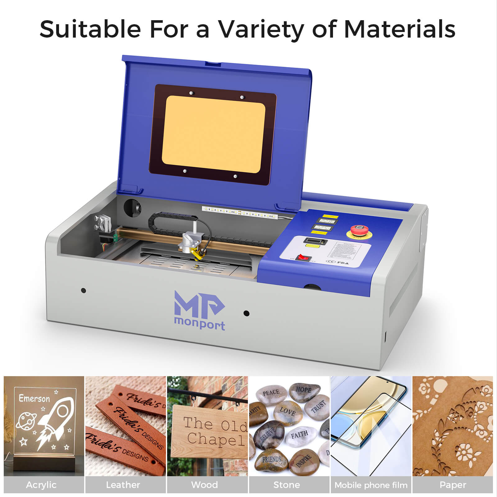 | Material Capability | Wood, glass, acrylic, fabric, leather, paper, cardboard, rubber. |