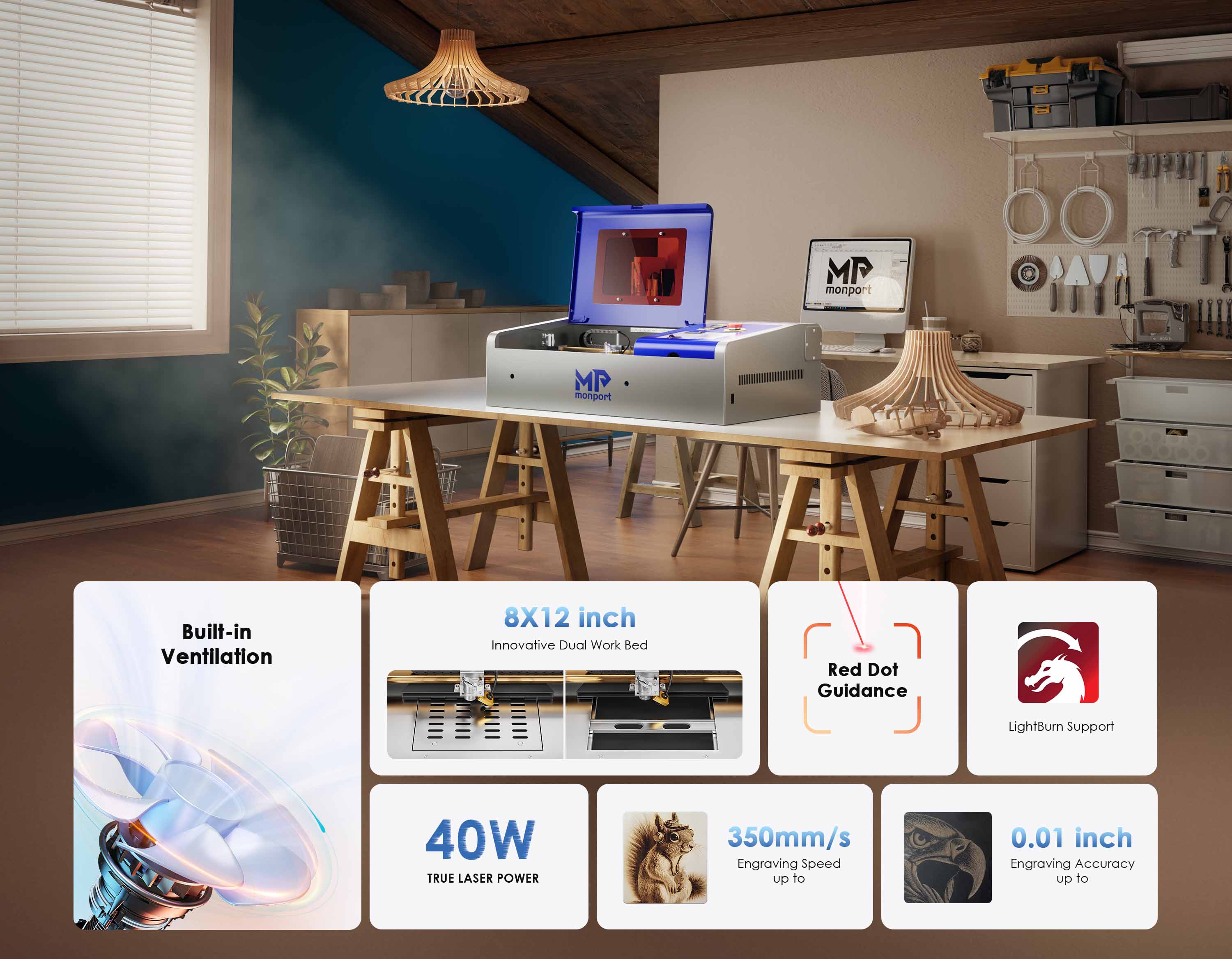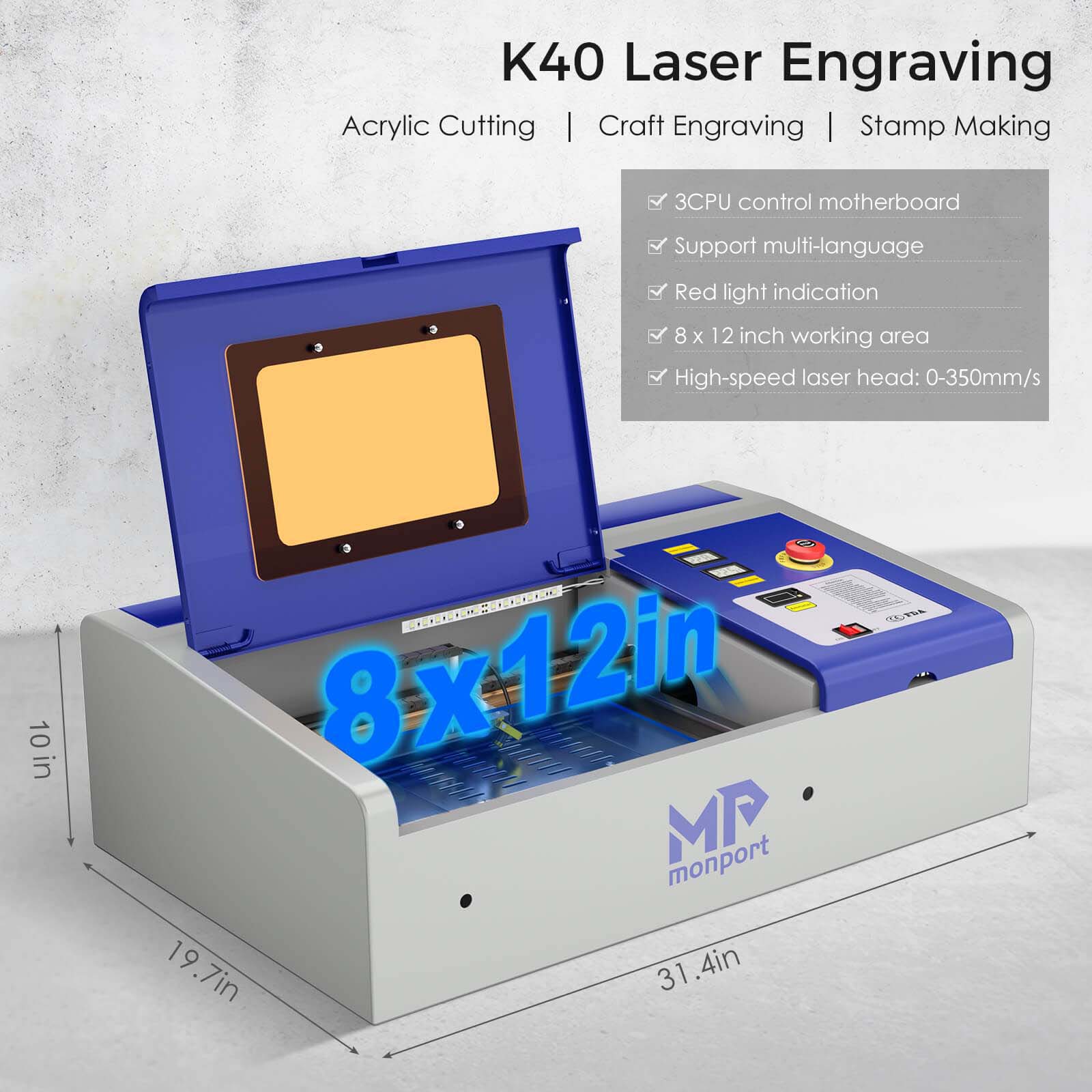 Monport 40W Lightburn-ready (12" X 8") CO2 Laser Engraver & Cutter with FDA Approval - 40W Basic