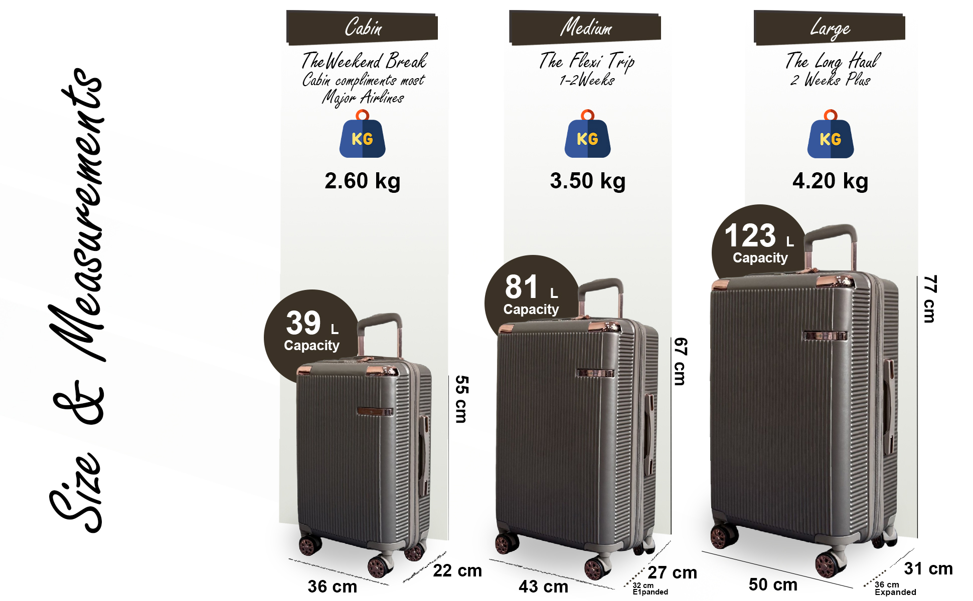 Kabine: 55 x 36 x 22 cm, 2,6 kg, 39l Medium: 67 x 43 x 27 (32 erweitert) cm, 3,50 kg, 81 l groß: 77 x 50 x 31 (36 erweitert) cm, 4,20 kg, 123L