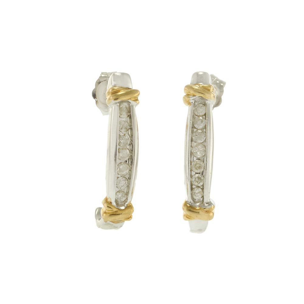 Elegant and timeless, these 14KT two-tone diamond half-hoop earrings feature a row of round brilliant diamonds totaling approximately 0.25 carats. Crafted in polished white gold and accented with twisted yellow gold detailing at the ends, the design balances subtle sparkle with a refined silhouette. These versatile earrings are perfect for both daily wear and understated evening elegance.