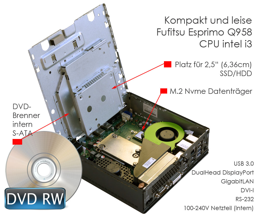 DVD-RW, Gigabit LAN, HD Audio, RS-232, Monitor Ausgange: DVI + 2x