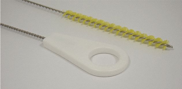 Pipe Brush, Handle Style Straight, Bristle Material Nylon, Handle Material Polypropylene, Brush Diameter 0.38 in, Brush Length 5 in, Handle Length 13 in, Bristle Color Yellow, Application Food Industry, Color Coding System Yes, FDA Compliant Yes, Features Single Spiral, Single Stem, Overall Length 18 in
