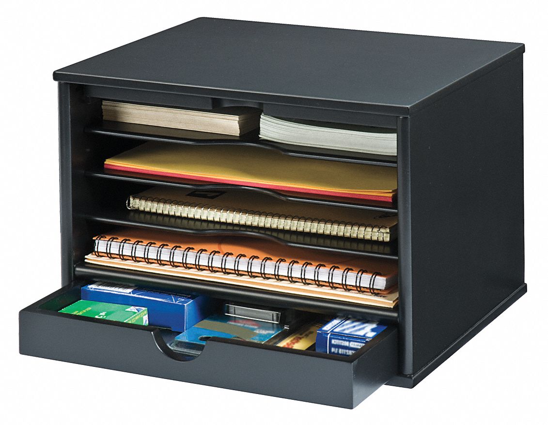 Desktop Organizer, Width 13 1/4 in, Depth 10 1/2 in, Height 9 3/8 in, Material Wood, Finish Matte, Color Black, Number of Compartments 5 This built-to-last collection offers functionality along with appealing design elements.