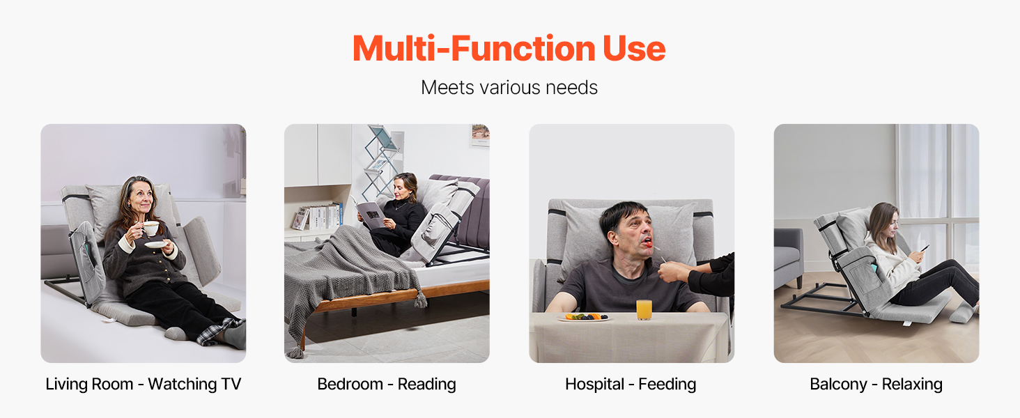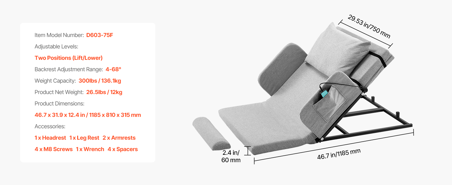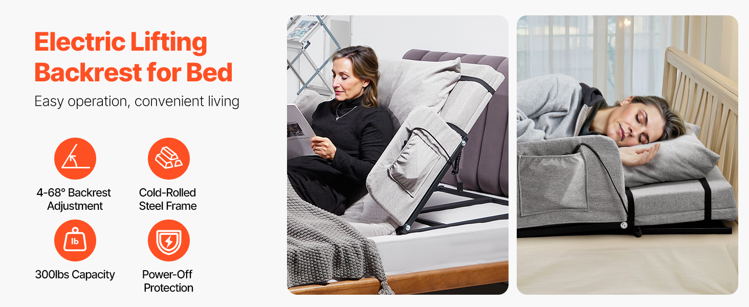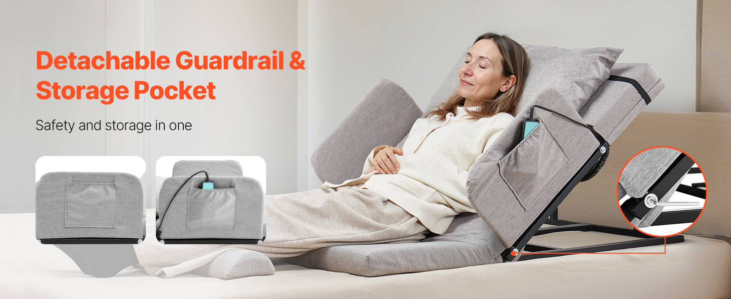 This power lifting bed backrest adjusts from 4° to 68°, featuring a 2.4" thick foam cushion, adjustable footrest, and fixed pillow. The washable headrest, detachable guardrail, storage pouch, and 300lb capacity steel frame ensure comfort, convenience, and stability. Ideal for various scenes.