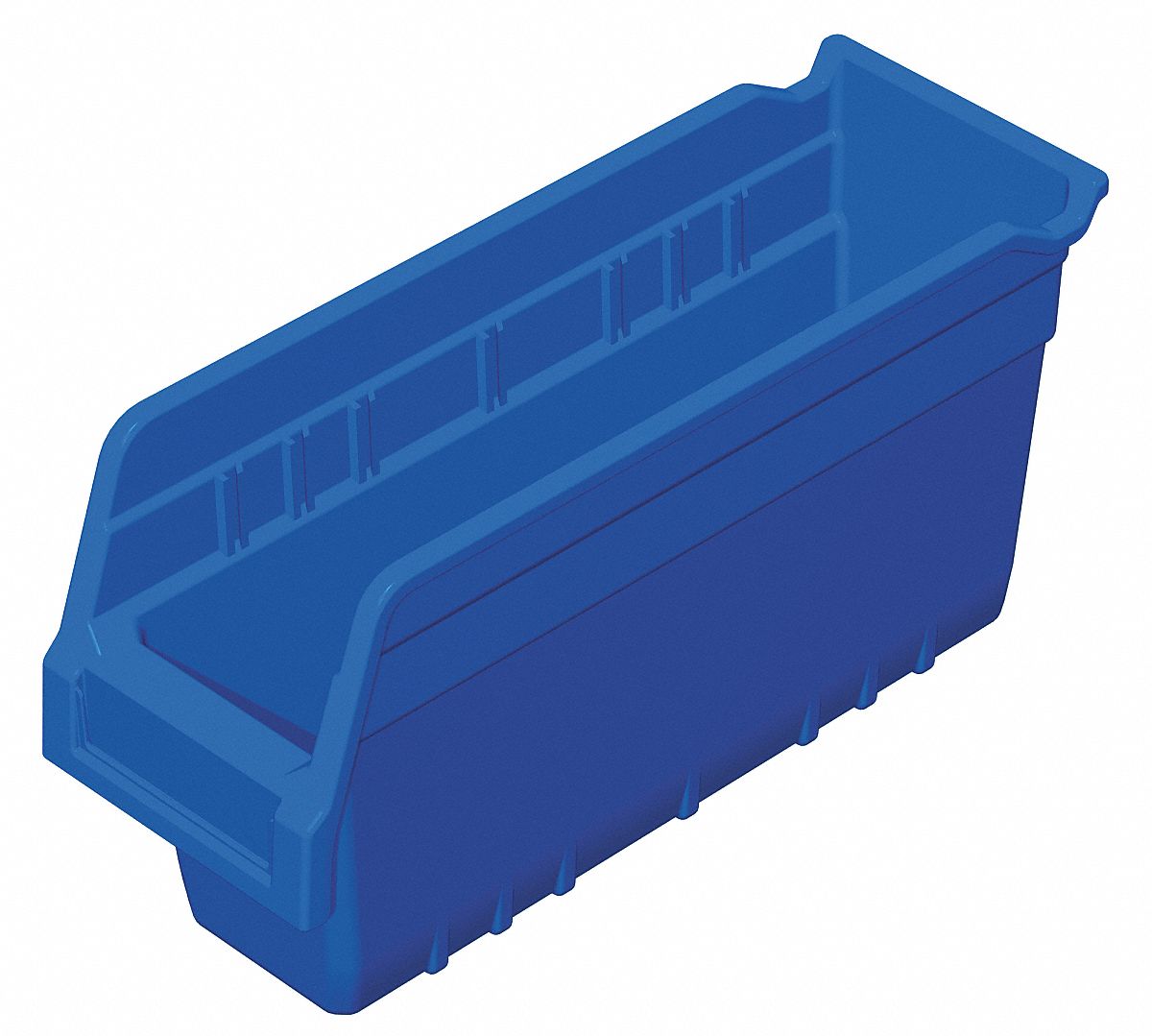 Shelf Bin, Color Blue, Includes Dividers No, Includes Label Holder Yes, Material Plastic, Overall Height 6 in, Overall Length 11 5/8 in, Overall Width 4 1/8 in, Weight Capacity 20 lb, Mobility Stationary, Nestable Yes, Number of Divider Slots 7, Number of Long Divider Slots 0, Number of Short Divider Slots 7, Number of Dividers 0, Caster Wheel Diameter Not Applicable, Divider Adjustment Increments Not Applicable, Electrostatic Discharge No, Hangable Yes, Hopper Height 6 in Made from industrial-grade polymers, this 6"-tall bin features a wide hopper front for easy access. It has a large label area, and is ideal for use with shelving or vertical storage and retrieval units. The reinforced side ribs provide added strength. The 1-pc. construction is waterproof and unaffected by grease or oil.