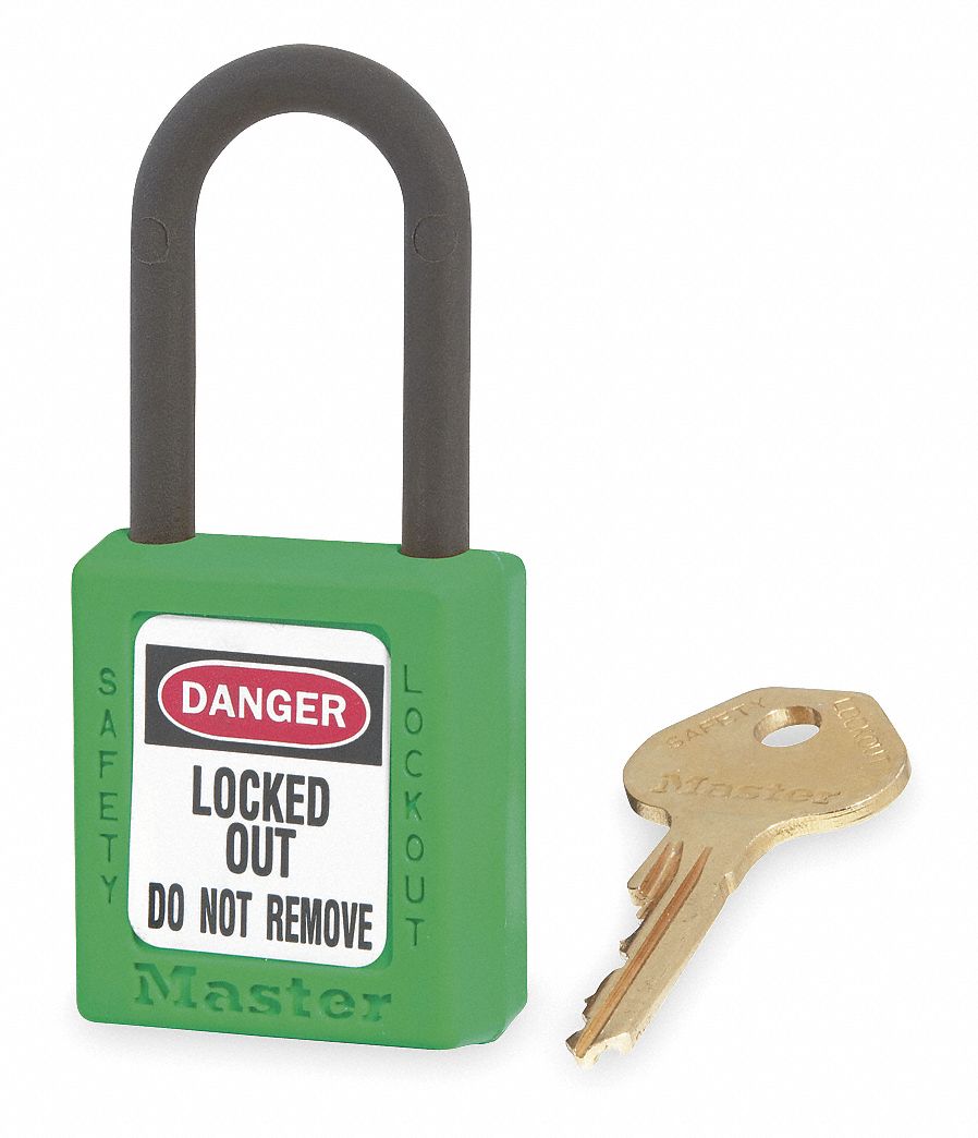 Lockout Padlock, Body Color Green, Body Height 1 3/4 in, Body Material Thermoplastic, Body Thickness 3/4 in, Body Width 1 1/2 in, Header Danger, Horizontal Shackle Clearance 25/32 in, Key Style Standard, Key Type Keyed Different, Non-Removable Key Yes, Resistance Properties Non-Conductive, Shackle Diameter 1/4 in, Shackle Height 1 1/2 in, Shackle Material Plastic, Shackle Type Open, Vertical Shackle Clearance 1 1/2 in, Width Across Shackle 25/32 in