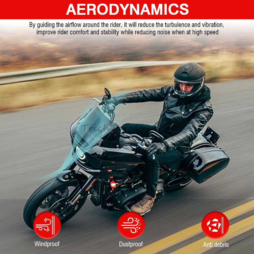 By guiding the around the rider, it will reduce the turbulence and vibration, improve rider comfort and stability while reducing noise when at high speed. Reducing rider fatigue on long trips by providing a smoother, more comfortable ride.