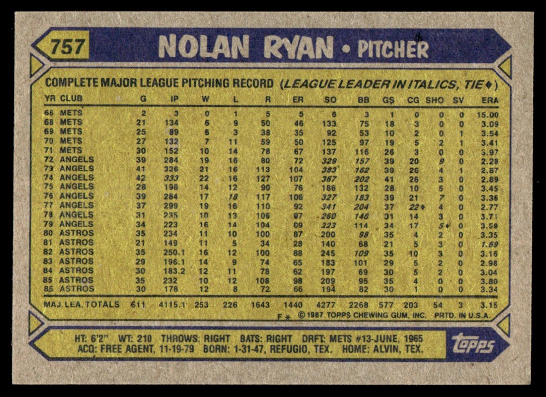 | NOLAN RYAN 1987 TOPPS #757 |