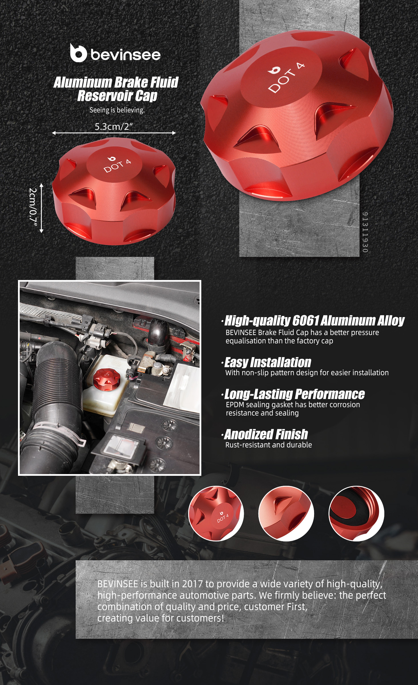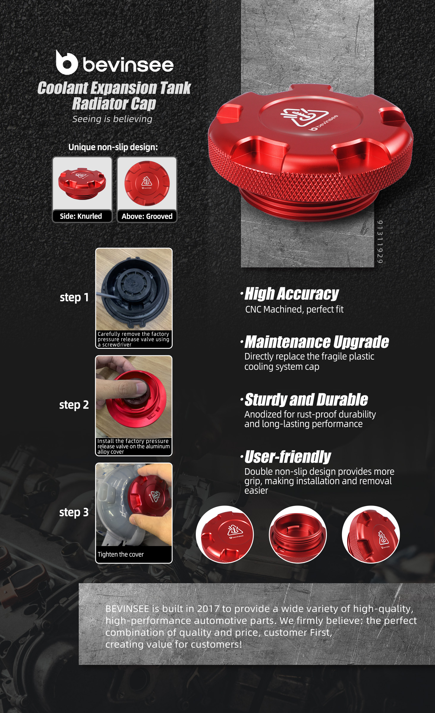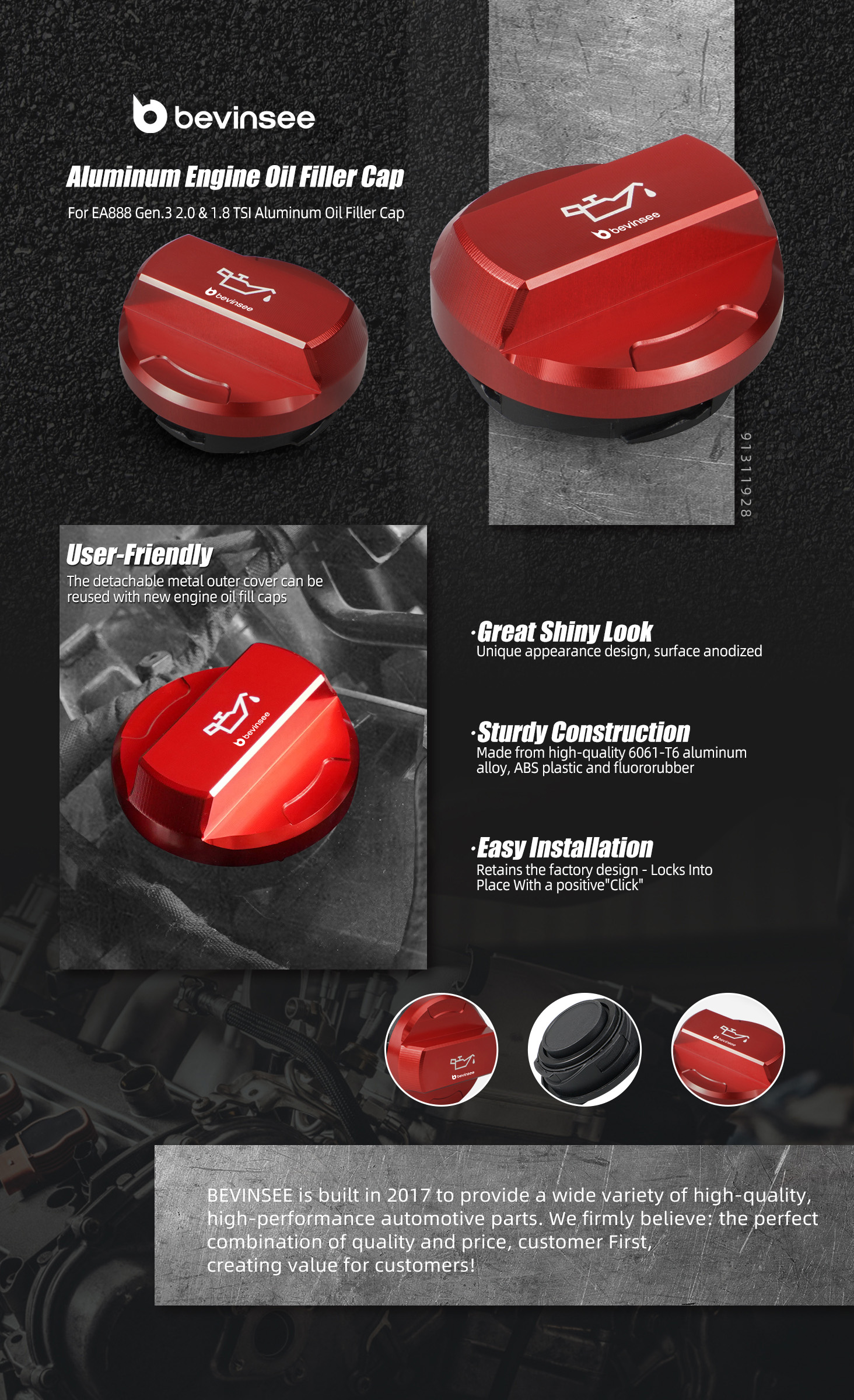 BEVINSEE Billet Aluminum Engine Dress Up Cap Updated for VW for Golf for Audi A3 TT Features: 【6061 Aluminum Alloy】The high temperatures in the engine compartment accelerate the aging of factory plastic cap. Upgrading to 6061 aluminum alloy ensures better heat resistance and durability, maintaining correct pressure and improving cooling efficiency. 【Enhanced Grip, Easier Installation】Featuring a double anti-slip pattern design, this cap offers greater friction compared to the factory one-piece handle, easy installation and removal. 【Anodized Finish】 The product surface is treated with anodization, making it more resistant to rust and durable. 【Sturdy and durable】CNC machined, anodized for rust-proof durability and long-term performance. 【Installation Tips】Please make sure the car is completely cooled before installation! Wear safey gloves. Specifications: Brand: BEVINSEE Condition: New Type: Brake Fluid Cap & Oil Filler Cap & Coolant Reservoir Cap Material: 6061 Aluminum Alloy Surface Finish: Anodized Color: Red Replacement Part Number: 5Q0611349B, 5Q0 611 349B, 3C0121321, 2Q0121321, 5Q0121321, 06K-103-485-C, 06K103485C, 06K 103 485 C, 06K103485A, 06K-103-485-A, 06K 103 485 A NOTE: 1. Only fit for 1.8L/2.0L EA888 Gen 3 or EA855 DAZA. 2. Ensure compatibility before purchasing. BEVINSEE brake fluid cap fits for brake master cylinder part number 3Q1614019D and brake expansion tank part numbers 5Q1611301D, 5Q2611301H. Additionally, ensure that your car's current brake fluid cap part number is 5Q0611349B for compatibility. Ensure that your reservoir cap part number is 3C0121321,2Q0121321,5Q0121321 for compatibility. Fitment: For VW For Golf 7 & 7.5 GTI & Clubsport 2013-2020 For VW For Golf 7 & 7.5 R 2013-2020 For VW For Golf 7 & 7.5 1.8 TSI 2013-2020 For VW For Passat 2.0 TSI B8 2015+ For VW For Arteon 2.0 TSI 2017+ For VW For T-Roc R 2.0 TSI 2019+ For VW For Tiguan II 2.0 TSI 2016+ For VW For Jetta / GLI 7 2018+ For VW For Polo 5 GTI 1.8 TSI 6C 2015-2018 For VW For Polo 6 GTI 2.0 TSI AW 2017-2021 For VW For Amarok 2010-2020 For Audi A3 2.0 TSI / 1.8 TSI 8V 2013-2020 For Audi S1 2.0 TFSI 2015-2018 For Audi S3 8V 2013-2020 For Audi RS3 2.5 TFSI 8V 2015-2017 For Audi RS3 2.5 TFSI 8V.2 evo 2017-2020 For Audi RS3 2.5 TFSI 8Y 2021+ For Audi Q3 45 TFSI 2.0 TSI 2019+ For Audi SQ2 2018+ For Audi RSQ3 F3 2019+ For Audi TTS 2.0 TFSI 8S 2015-2021 For Audi TTRS 2.5 TFSI 8S 2017+ For SEAT Leon III Cupra 5F 2014-2020 For SEAT Leon III 1.8 TSI 5F 2015-2020 For Skoda Octavia III vRS 2.0 TSI 5E 2014-2020 For Skoda Superb III 1.8 / 2.0 TSI 3V 2015+ Package Included(Set of 3): 1x Engine Oil Fill Cap, 1x Brake Fluid Cap, 1x Coolant Reservoir Cap DISCLAIMER