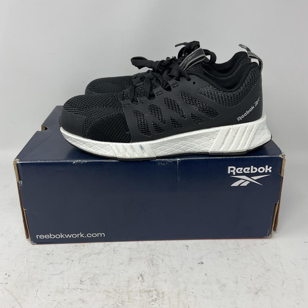 Description The Reebok Work Fusion Flexweave - RB413 Composite Toe work shoes maximize flexibility with Floatride Foam that provides lightweight support and feature a wider toe box for a roomier fit. These work sneakers also feature tough safety toe protection to keep you safe all day long. Style number: RB413 (Black/White) Work sneakers with a composite safety toe that meets ASTM F2413 I/C (Impact and Compression), EH (electrical hazard) safety standards. Ultraknit and Flexweave upper for lightweight, durable support. Flexweave Technology knits supportive fibers into a figure-8 design to add strong, flexible structure. Low-cut design for freedom of motion and quicker transitions. Lace-up style with fabric laces and synthetic loops for a secure fit. Breathable mesh lining for a comfortable fit. Cushioned textile footbed provides long-lasting underfoot comfort and support. Floatride Energy Foam core is significantly lighter than traditional EVA foam, providing soft, lightweight cushioning. Durable synthetic outsole with adaptive lugs on the bottom flex to match the foot's natural movement. Outsole has excellent slip, oil, chemical, heat, and abrasion resistance that meets and exceeds MARK II Standard of .60 oily/wet. The outsole is also resistant to metal chips.