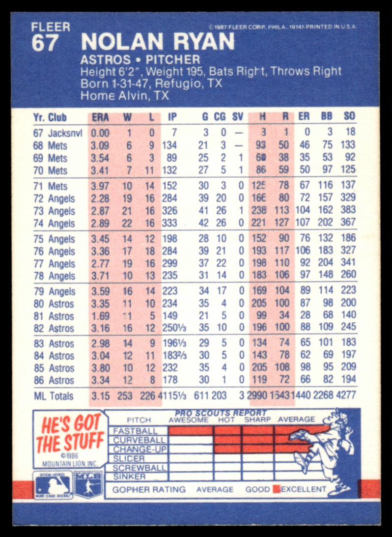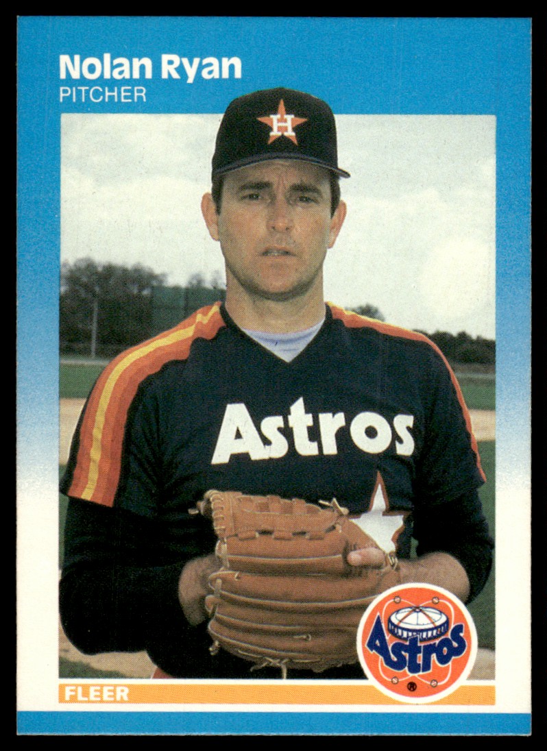 | Description: | Nolan Ryan | | Category: | Baseball | | Year: | 1987 | | Product: | Fleer | | Team: | Houston Astros | | Card Number: | 67 | | Dimensions: | 3½" x 2½" | | SKU: | BL 012024 R10 F (75) |