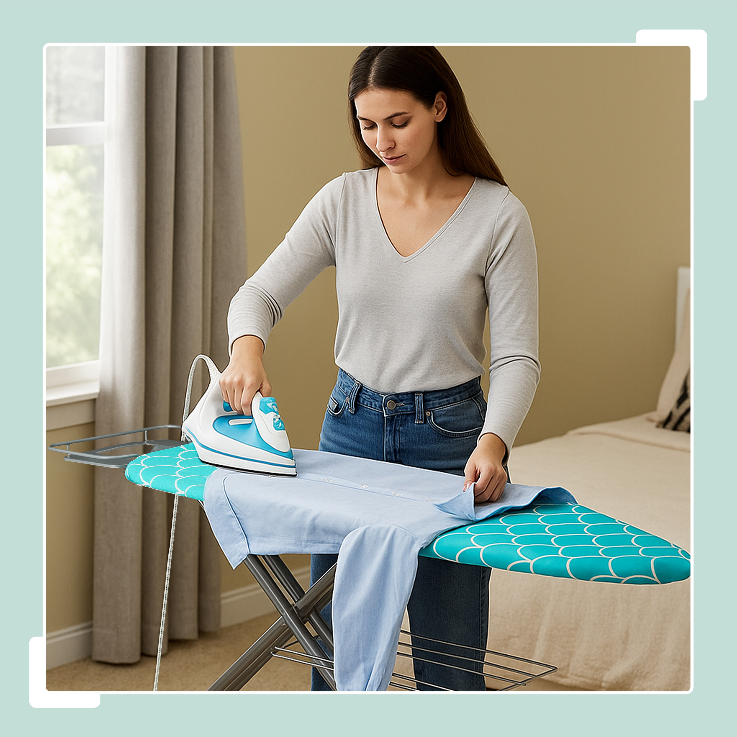 - Groß: Bügelbrett mit breiter Bügelfläche ca. 122 x 39,5 cm - Abnehmbarer Bügelbrettbezug in Türkis