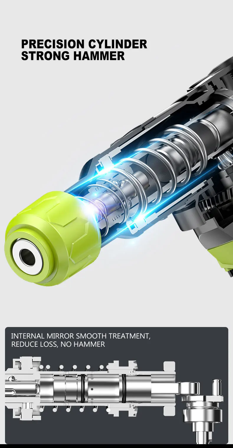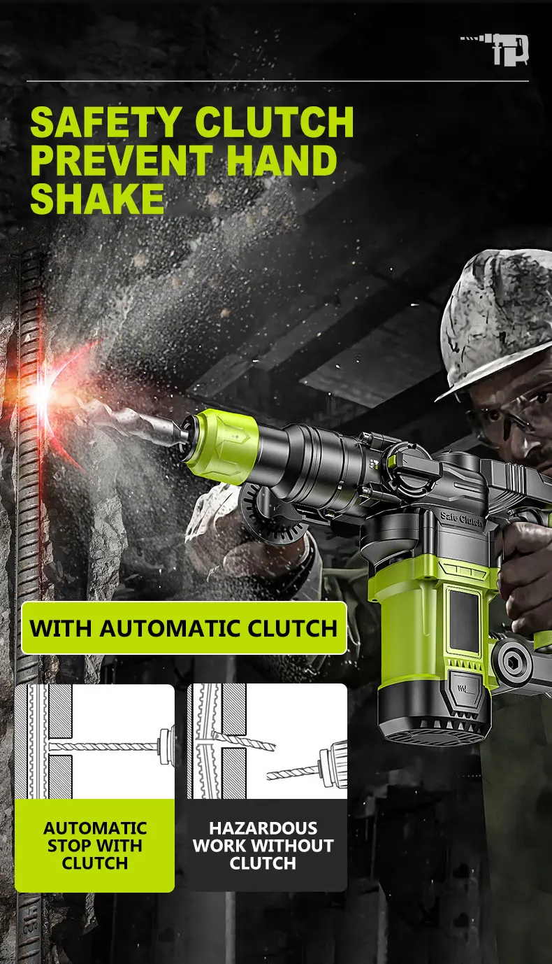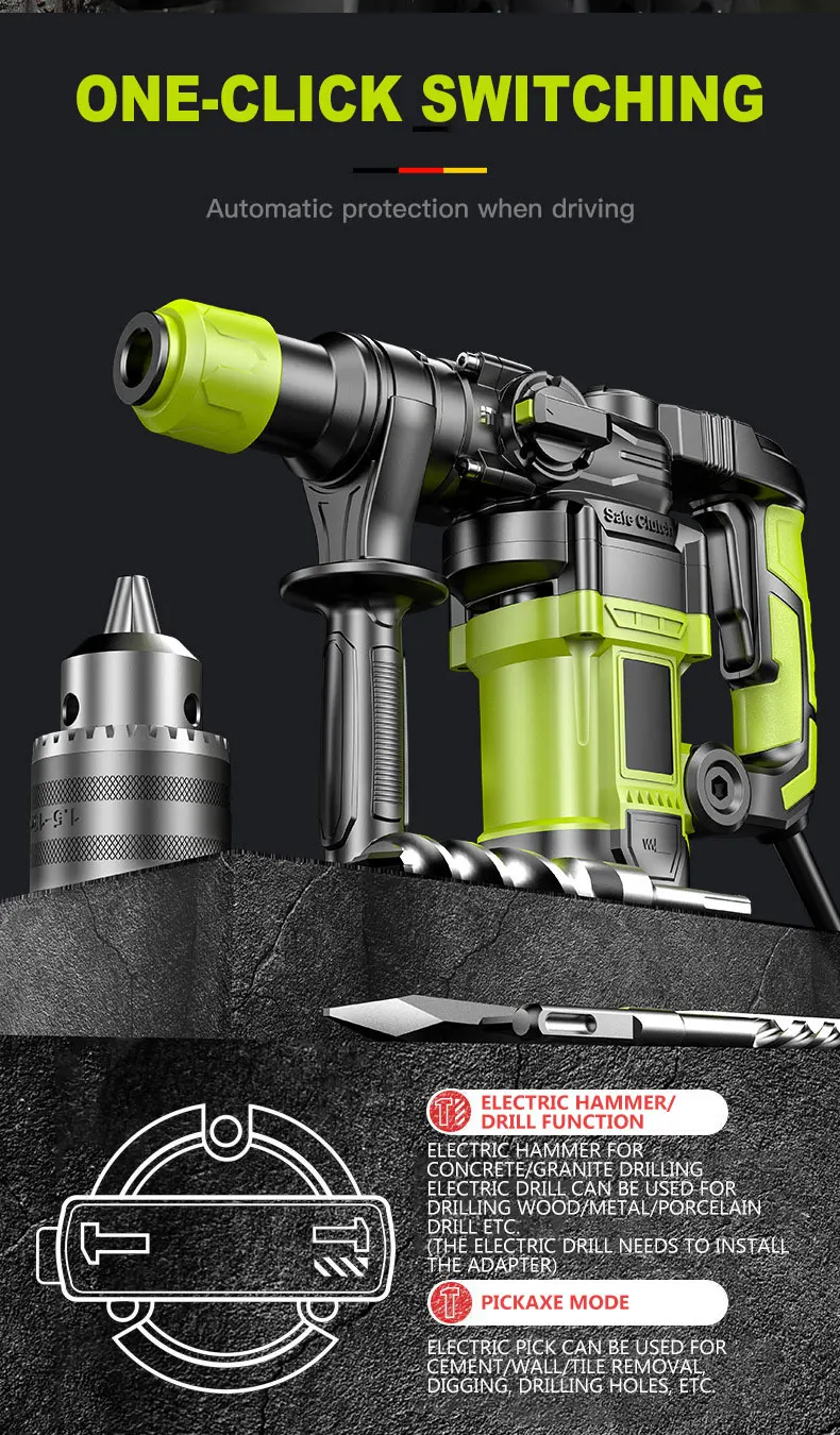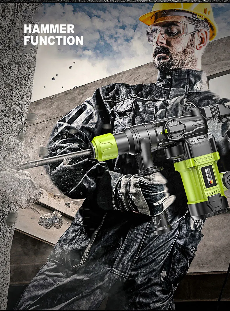 Model: 20980w Mode switching: one machine with three functions Shock absorption system: six fold shock absorption Safe clutch: intelligent clutch Clamping diameter: 28mm Weight: 5.4kg Speed: 1000r/min