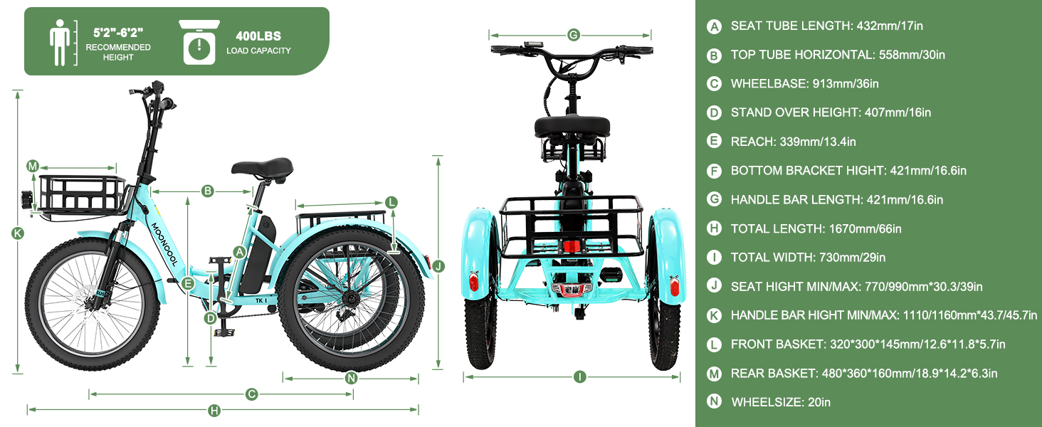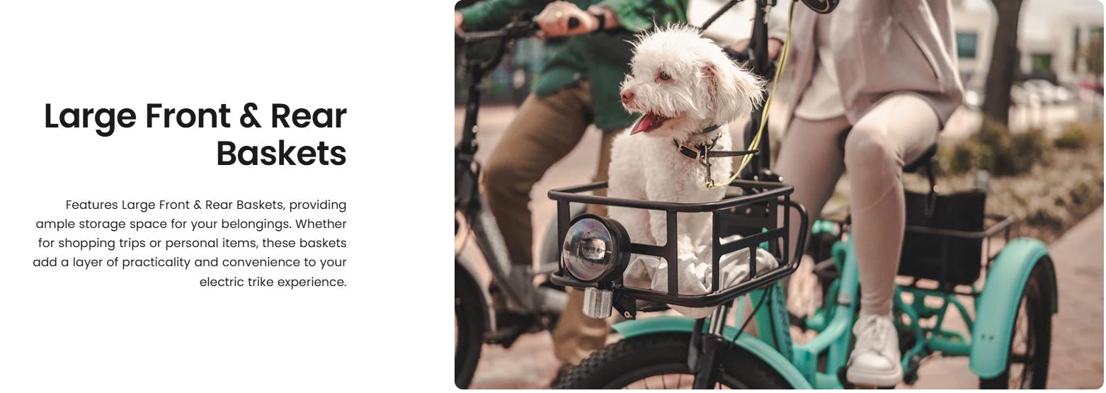 【Foldable Convenience】: Enjoy easy portability and storage with its foldable design, making it perfect for commuting and storage in small spaces. Benefit from the spacious front and back baskets, combining stability and ample storage for your trips. This three-wheel electric bike is stylish & prioritizes safety, making it an ideal choice for adult and senior riders.