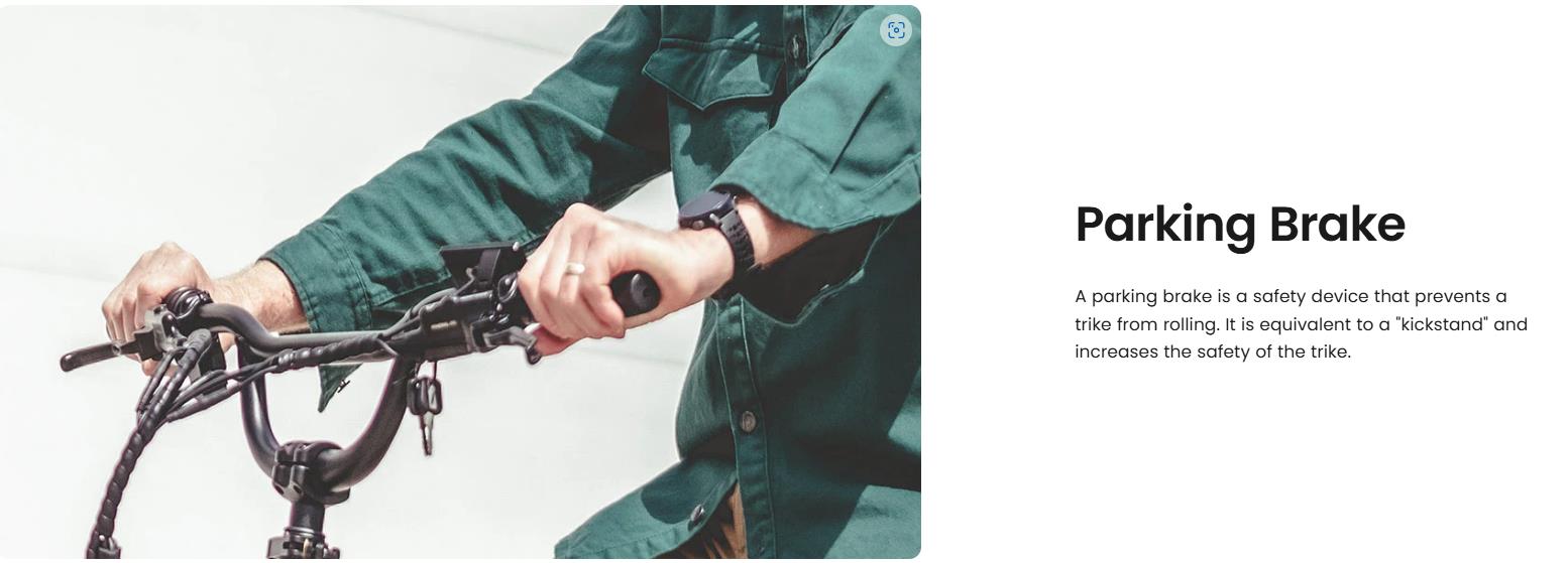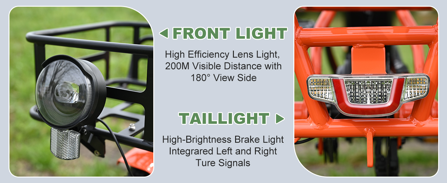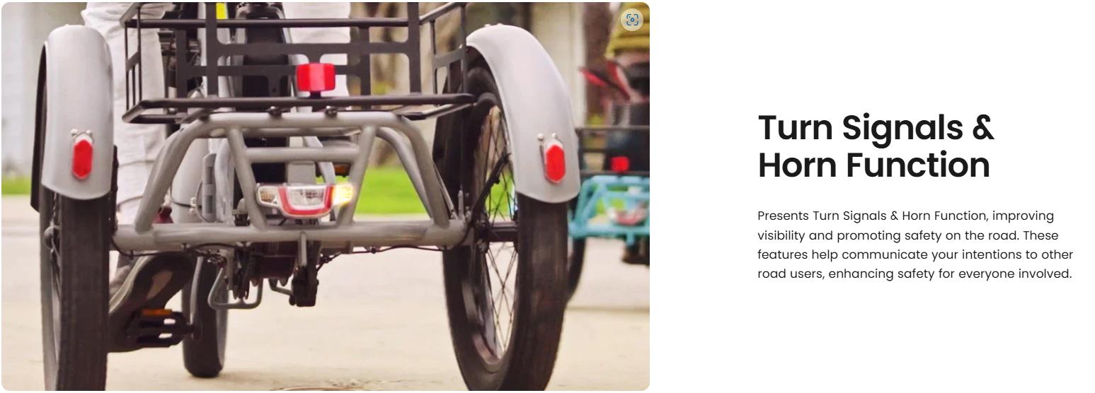 【Durable Aluminum Frame】: Built to last, the folding electric tricycle is featured with the 6061 aluminum bike frame, ensures strength and longevity, providing a sturdy foundation for your rides.The tricycle features turn signals, brake lights, and tail lights ensuring a safe experience.