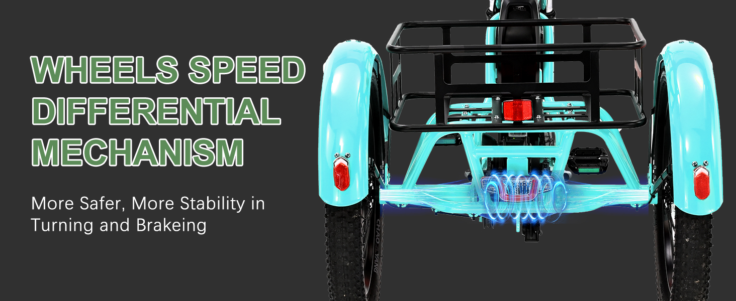 【500W Motor & Rear Speed Differential】: The electric trike comes with a 48V 500W helical motor. Not only enhances your speed and torque but also eliminates any concerns of startup slippage, guaranteeing a smooth riding experience.