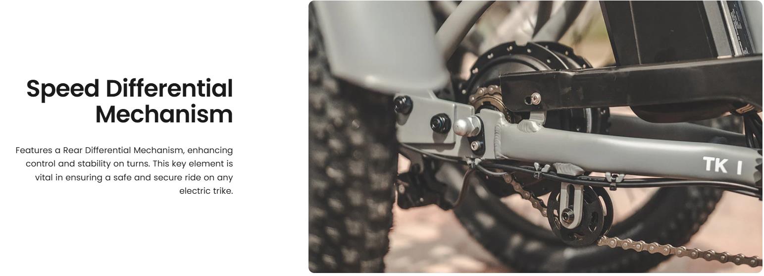 【500W Motor & Rear Speed Differential】The electric trike comes with a 48V 500W helical motor. Not only enhances your speed and torque but also eliminates any concerns of startup slippage, guaranteeing a smooth riding experience.