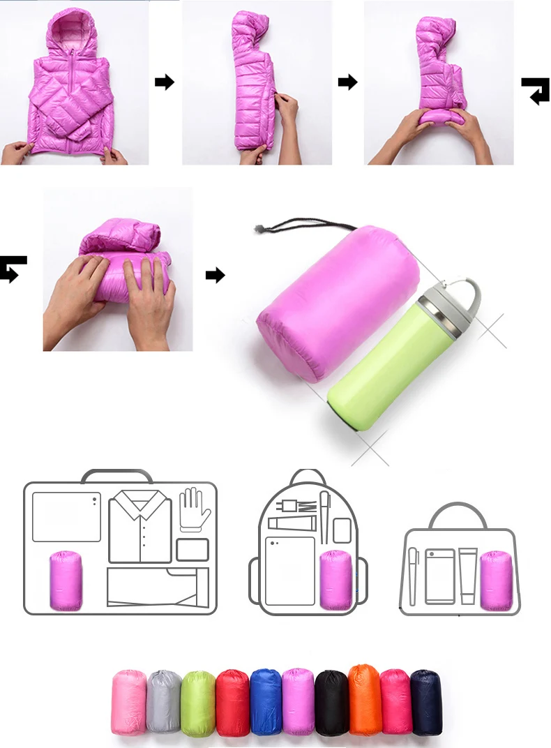 1. This is ultra light duck down jacket, the weight is about 0.15-0.30kgs.