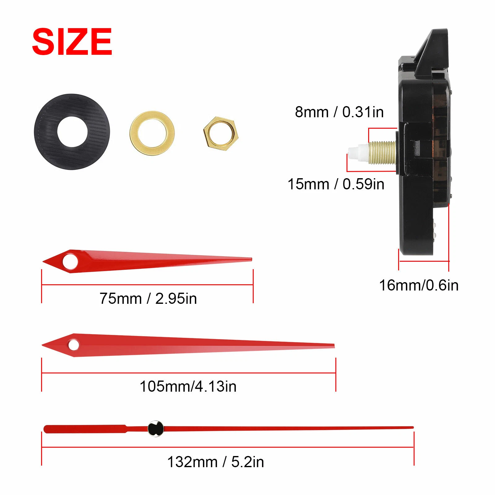 Total Shaft Length: 15mm/0.59in, thread length: 8mm/0.31in, suitable for 1~5mm/0.04~0.2inch thickness clock panel.