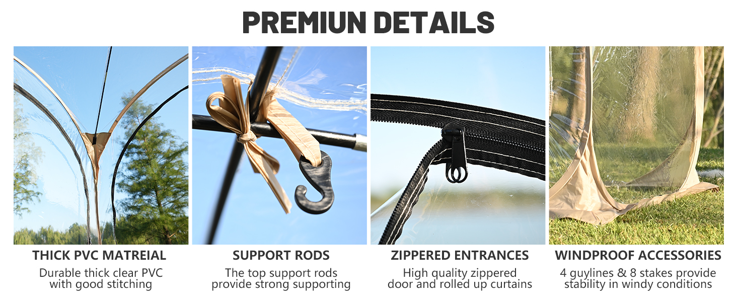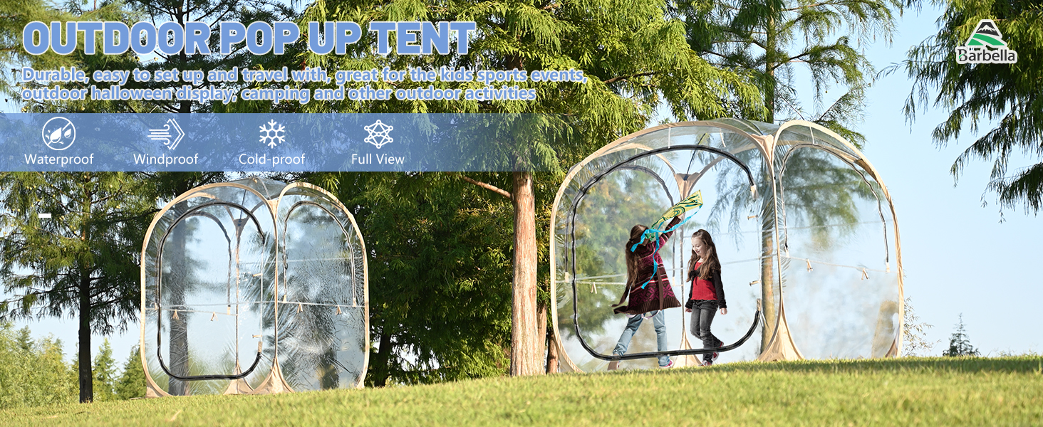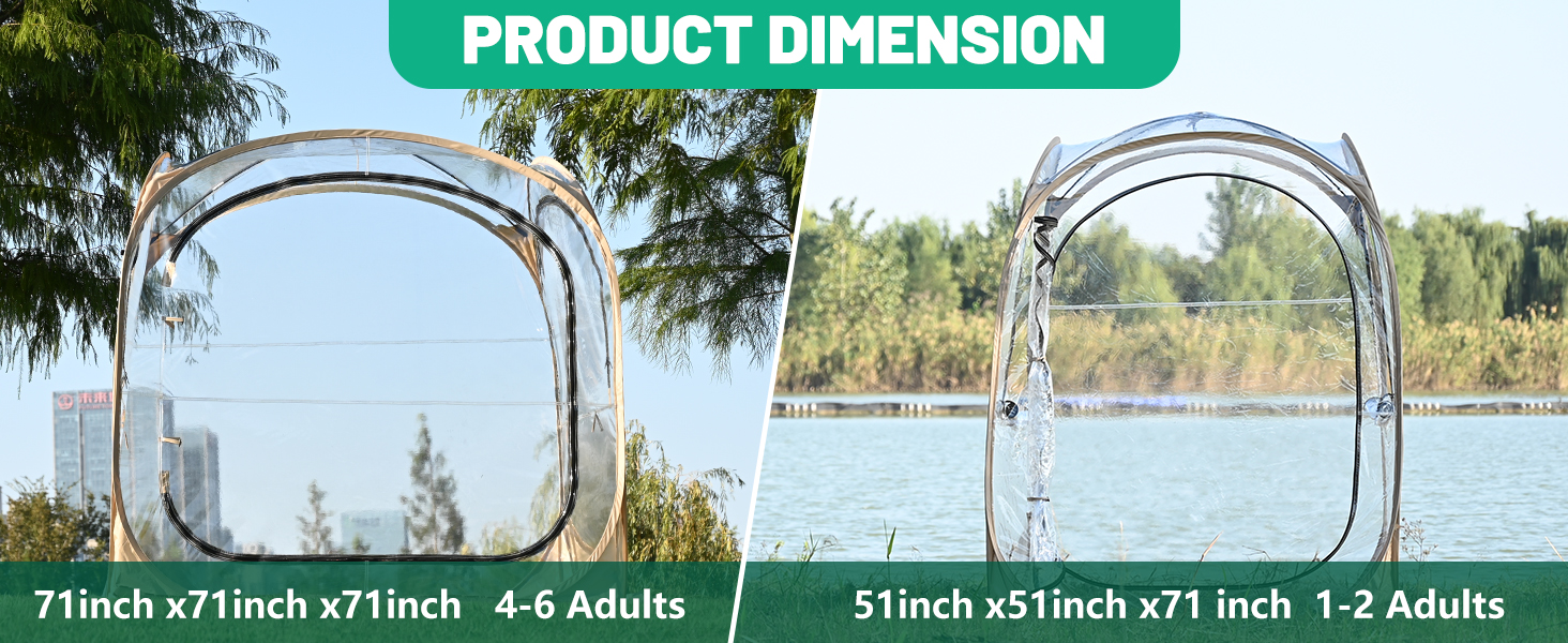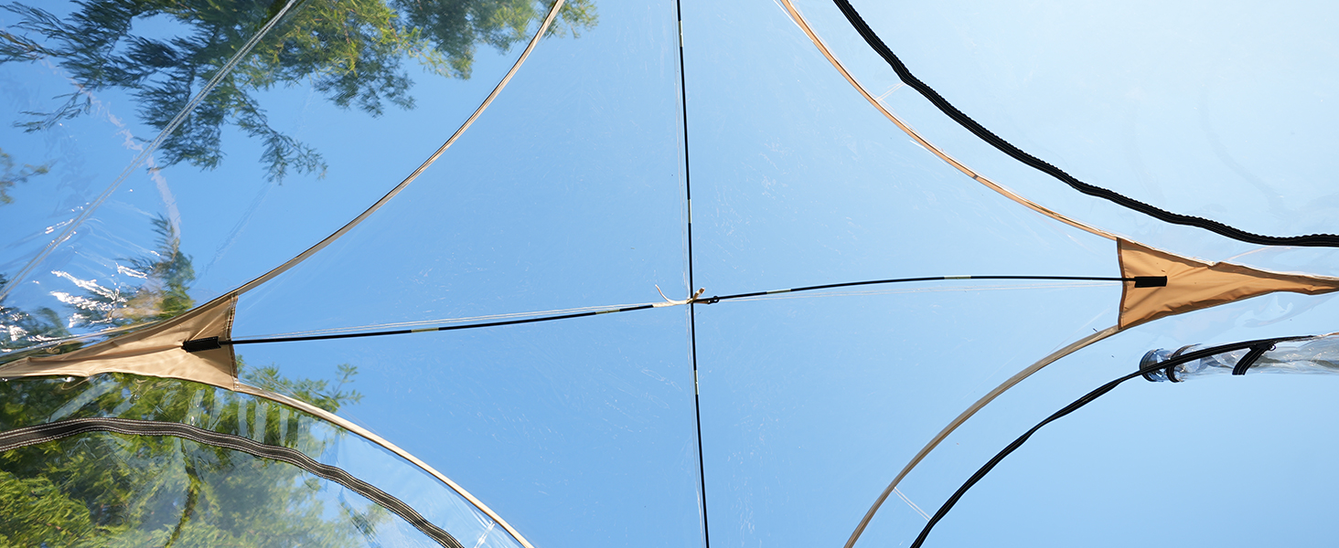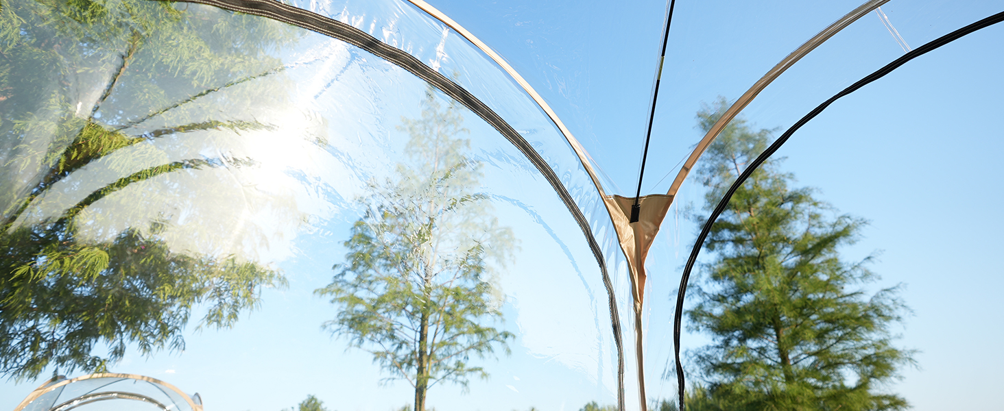 【Clear View Tent】: This camping tent made from ultra-transparent PVC, offers a 540°ultra clear view of your surroundings. Ideal for outdoor games such as soccer, baseball, softball, field hockey, and a variety outdoor activities such as fishing, camping, BBQ. The fully transparent roof is perfect for stargazing at night. All weather shelter rain tent for outdoor events.