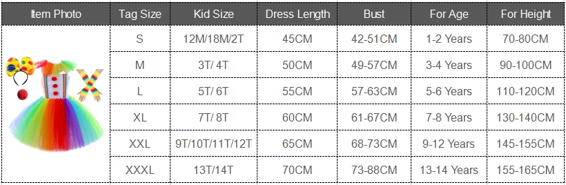 1.The dress length is from underarms to dress bottom. It's Knee Length Rainbow Circus Clowns Tutu Costumes for Baby Girls Kids. 2.The manual measurement may have 1-3 cm error. Unit size is cm,1 inch=2.54 cm,1 cm=0.39 inch. 3.The crochet top is elastic and stretched scope is about 42-88 cm. 4.The suggested age and height is just for your reference. Please choose size according to your kid's actual height and age.