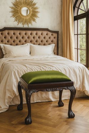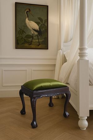 Die großzügige Sitzfläche ist mit grünem Samt bezogen, was den Hocker nicht nur pflegeleicht macht, sondern ihm zugleich eine elegante Note verleiht.