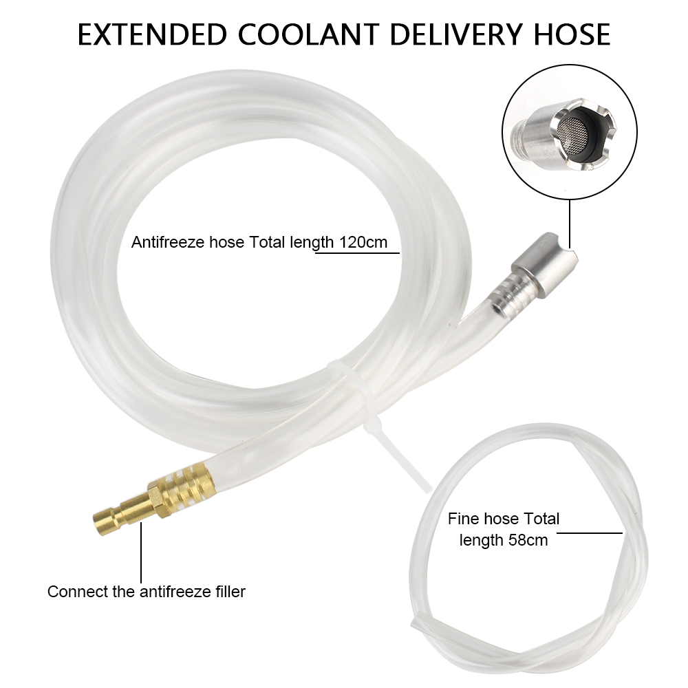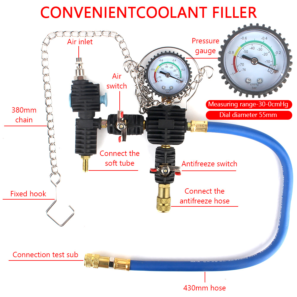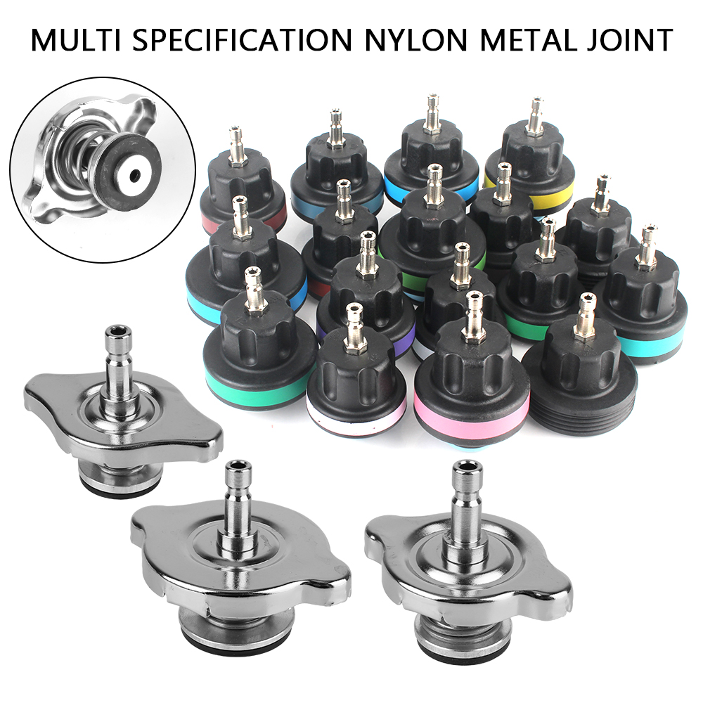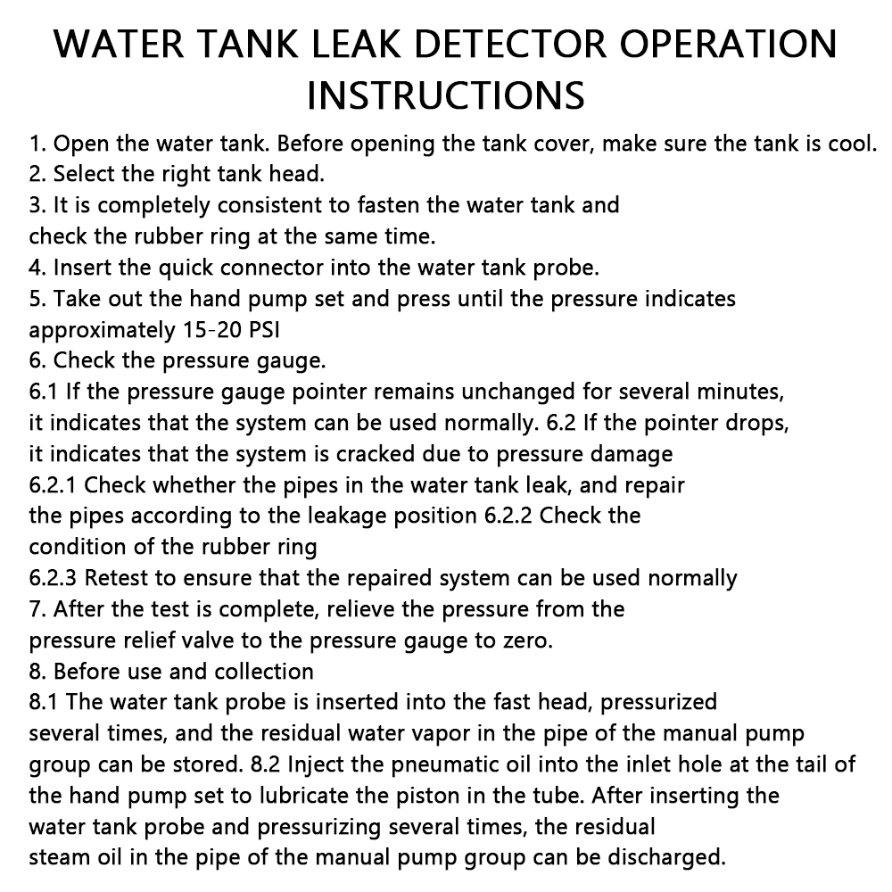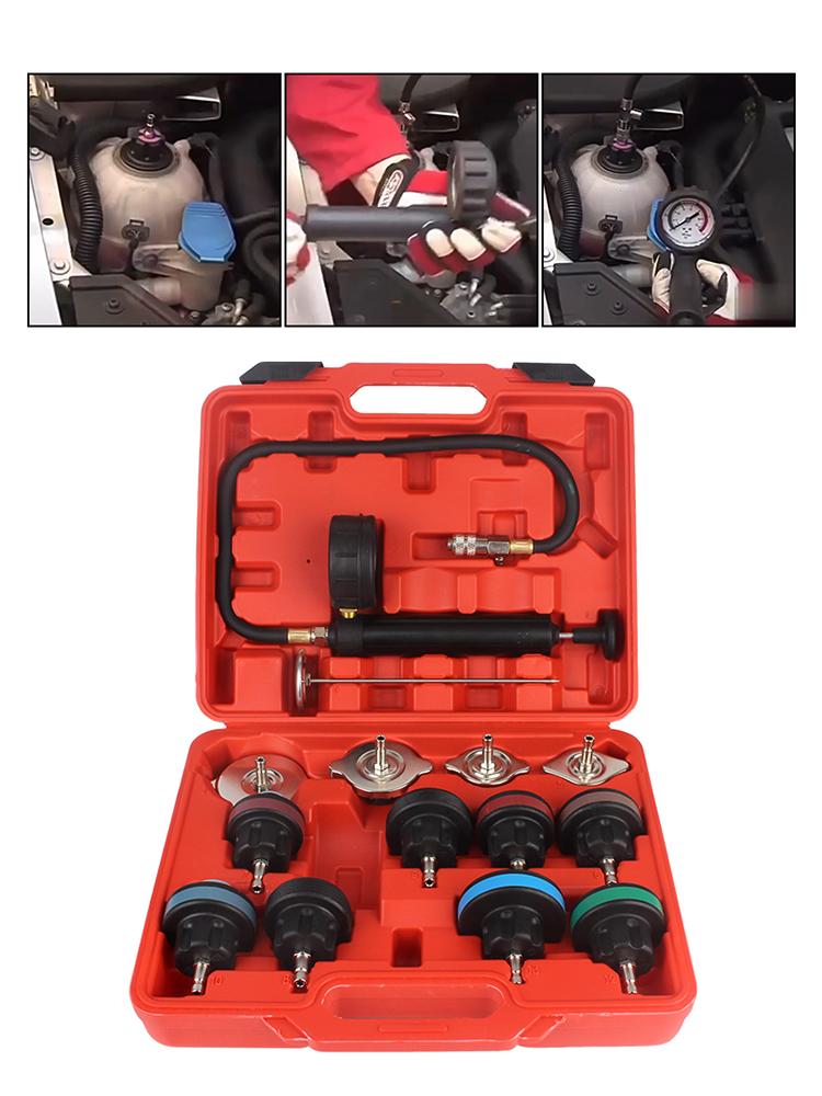 Set includes: Pressure Testing Pump w/ Hose, Quick Coupler with Pressure Release, and Gauge: Test Range 0 - 35 psi , 2pcs Radiator Cap Test Adapters to test for original radiator cap pressure release/cap leakage