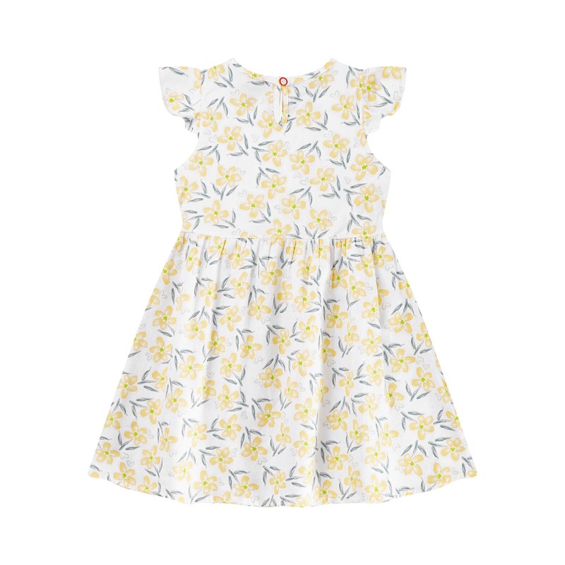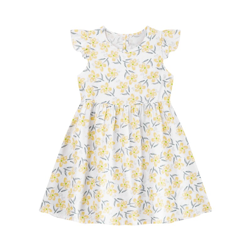 Cap sleeve dress with floral print and ruffled details make your girl look cute and energetic.