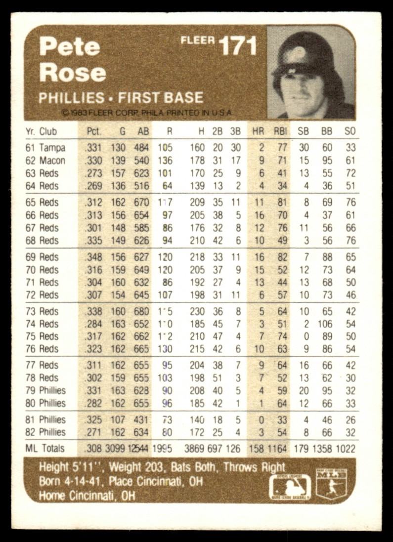 | Description: | Pete Rose | | Category: | Baseball | | Year: | 1983 | | Product: | Fleer | | Team: | Philadelphia Phillies | | Card Number: | 171 | | Dimensions: | 3½" x 2½" | | SKU: | BL 012024 R10 G (66) |