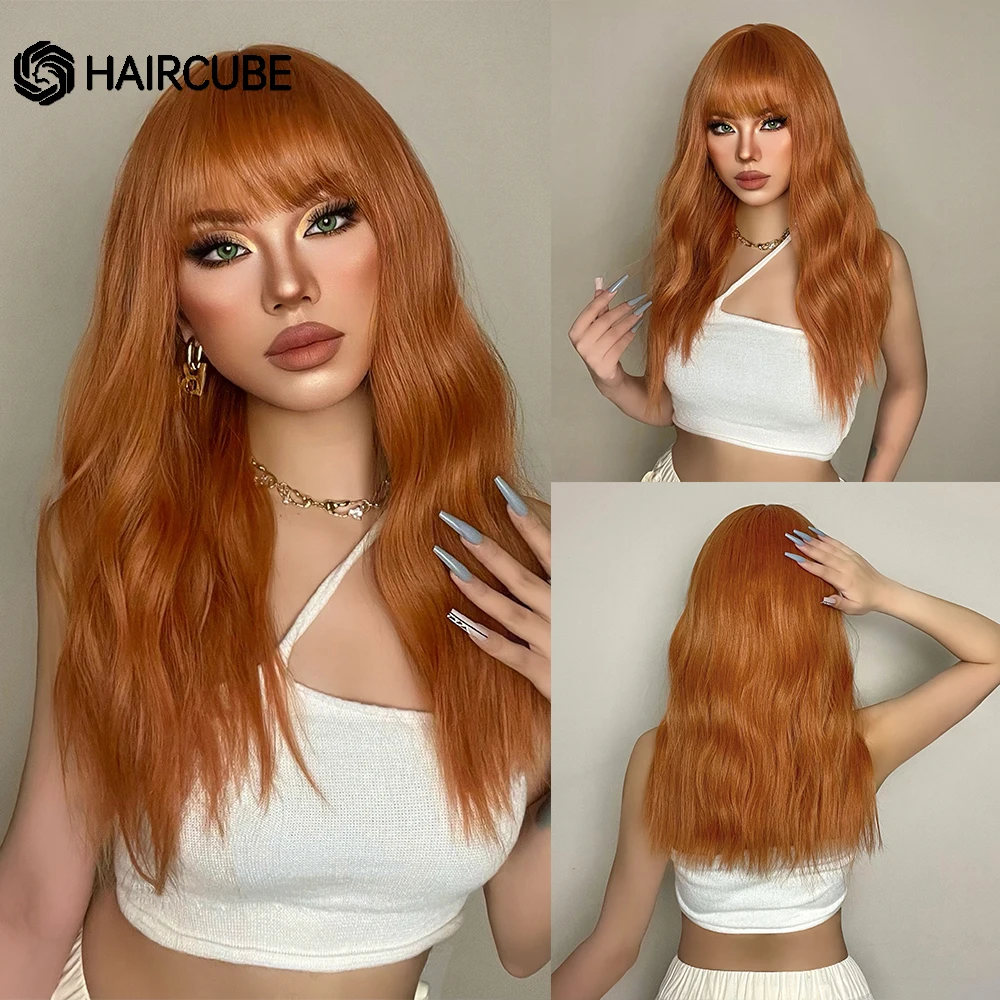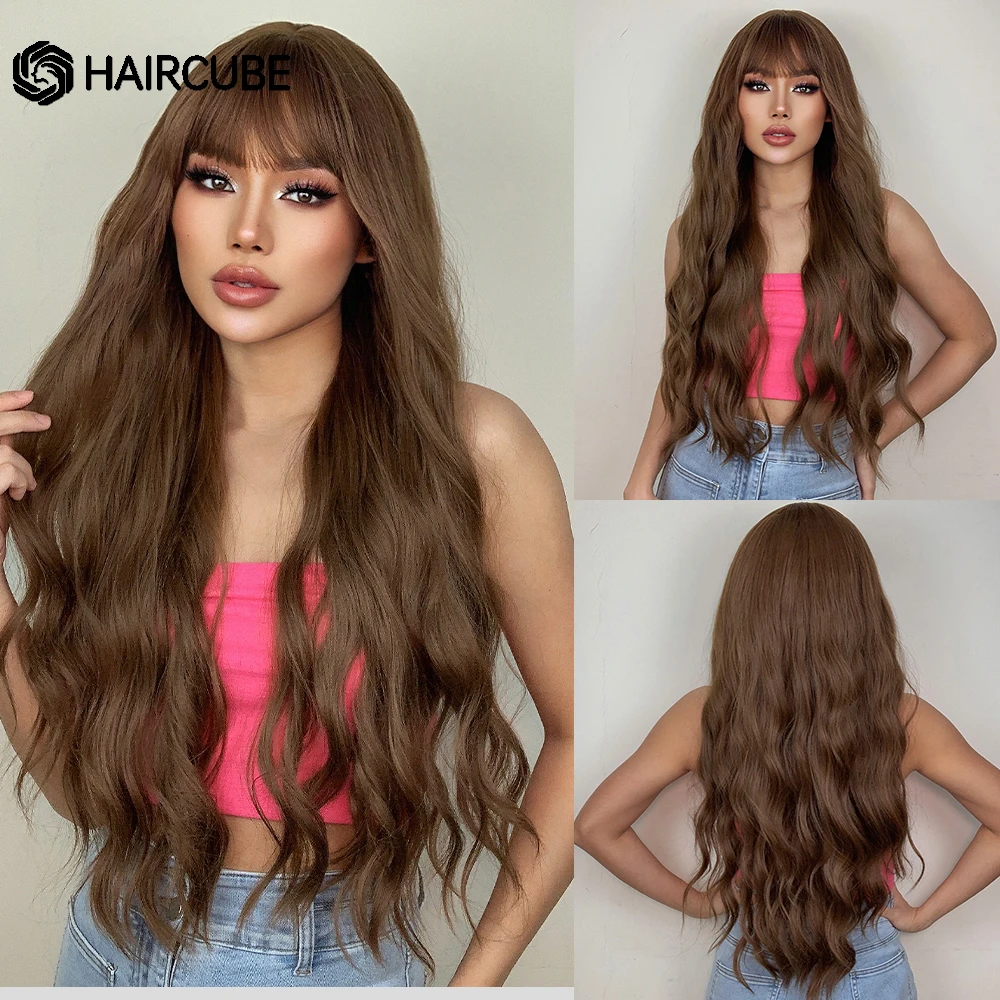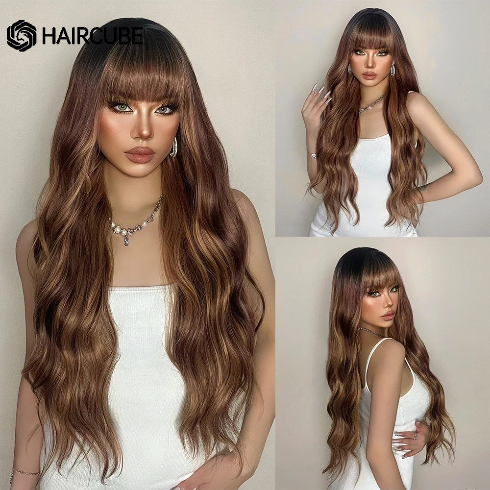 HAIRCUBE Long Wavy Brown Highlight Synthetic Wigs for Black Women With Bangs Natural Hair Daily Party Heat Resistant Fiber Wigs